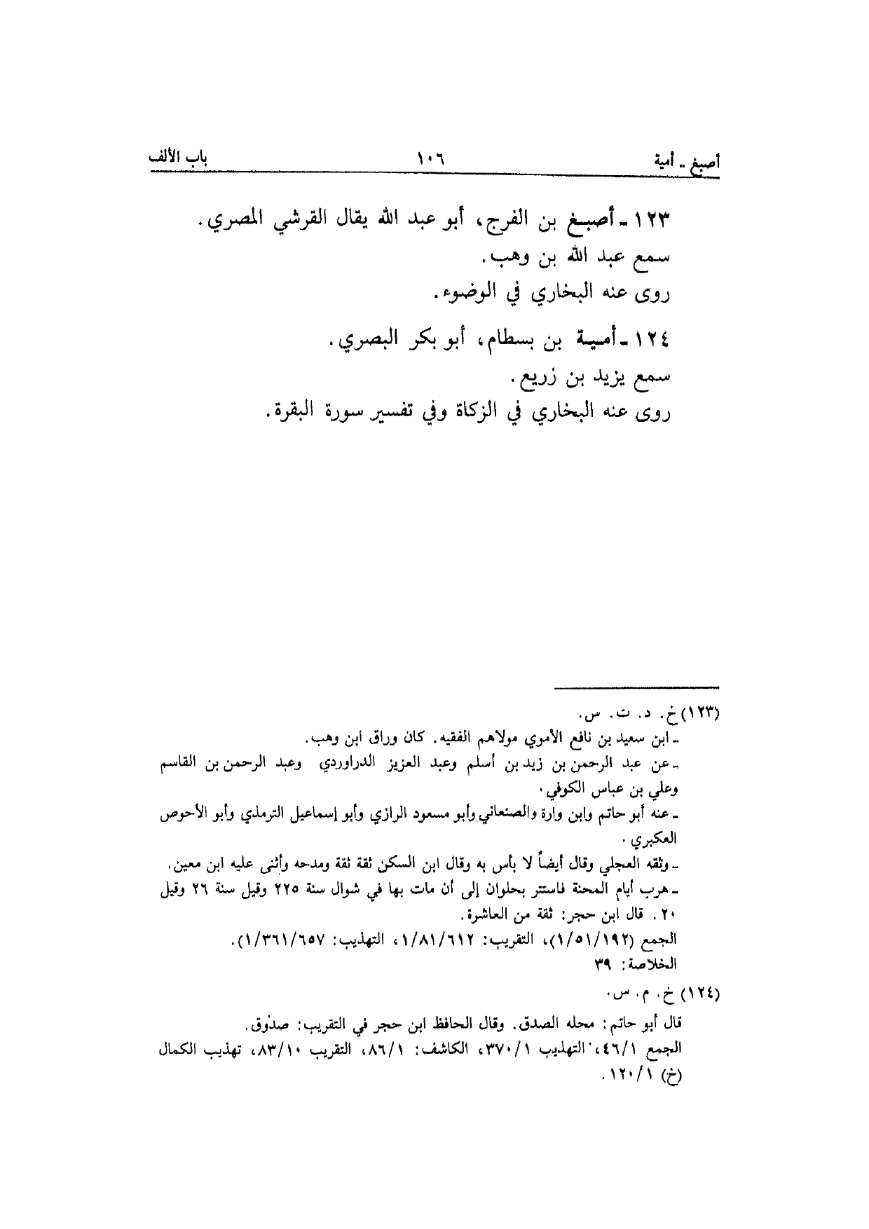 123 - أصبغ بن الْفرج أَبُو عبد الله يُقَال الْقرشِي الْمصْرِيّ سمع عبد الله بن وهب رَوَى عَنهُ البُخَارِيّ فِي الْوضُوء