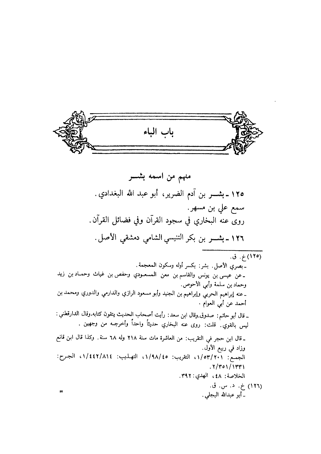 125 - بشر بن آدم الضَّرِير أَبُو عبد الله الْبَغْدَادِيّ سمع عَلّي بن مسْهر رَوَى عَنهُ البُخَارِيّ فِي سُجُود الْقُرْآن وَفِي فَضَائِل الْقُرْآن