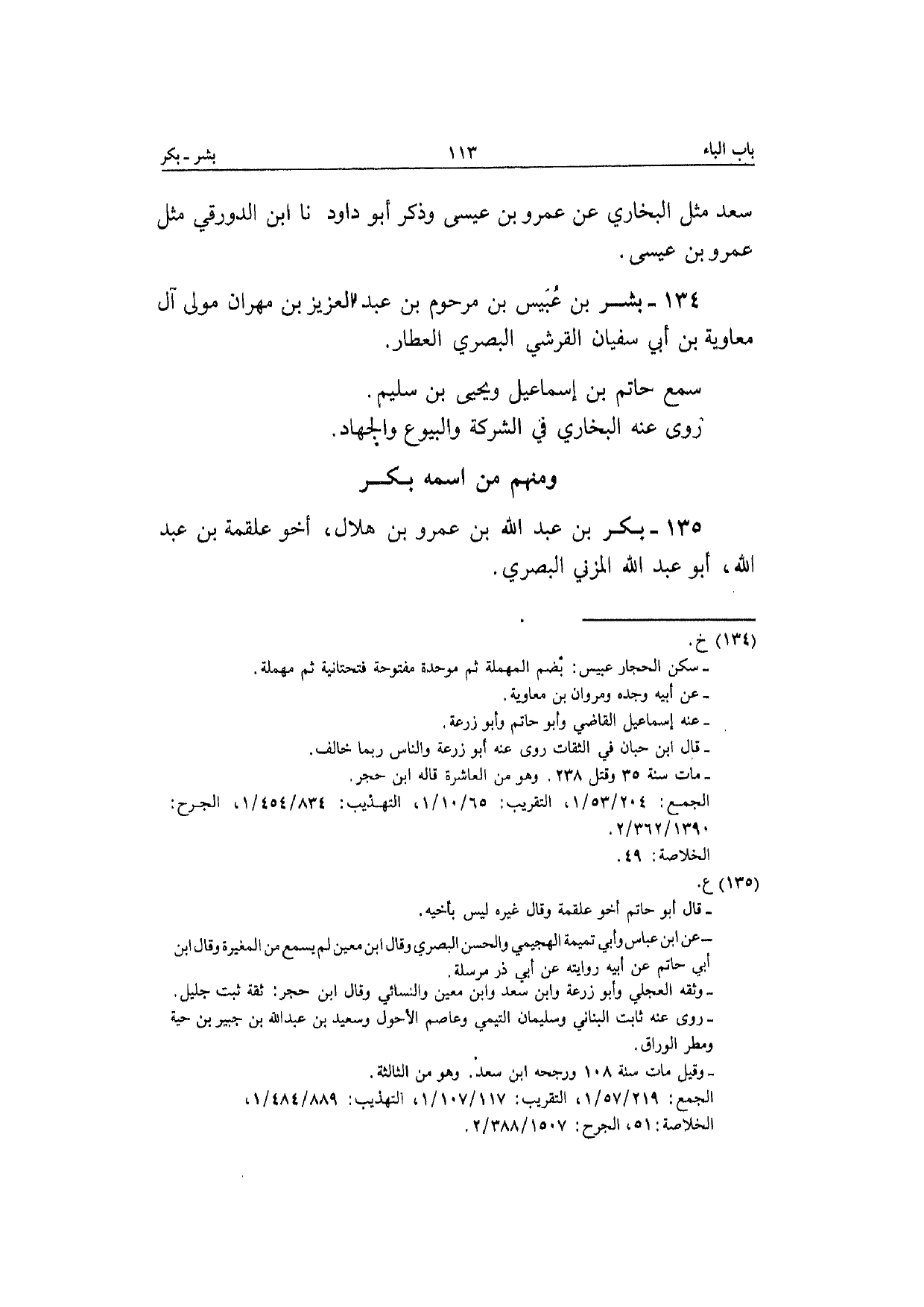 134 - بشر بن عُبَيْس بن مَرْحُوم بن عبد الْعَزِيز بن مهْرَان مولَى آل مُعَاوِيَة بن أبي سُفْيَان الْقرشِي الْبَصْرِيّ الْعَطَّار سمع حَاتِم بن إِسْمَاعِيل وَيَحْيَى بن سليم رَوَى البُخَارِيّ فِي الشّركَة والبيوع وَالْجهَاد