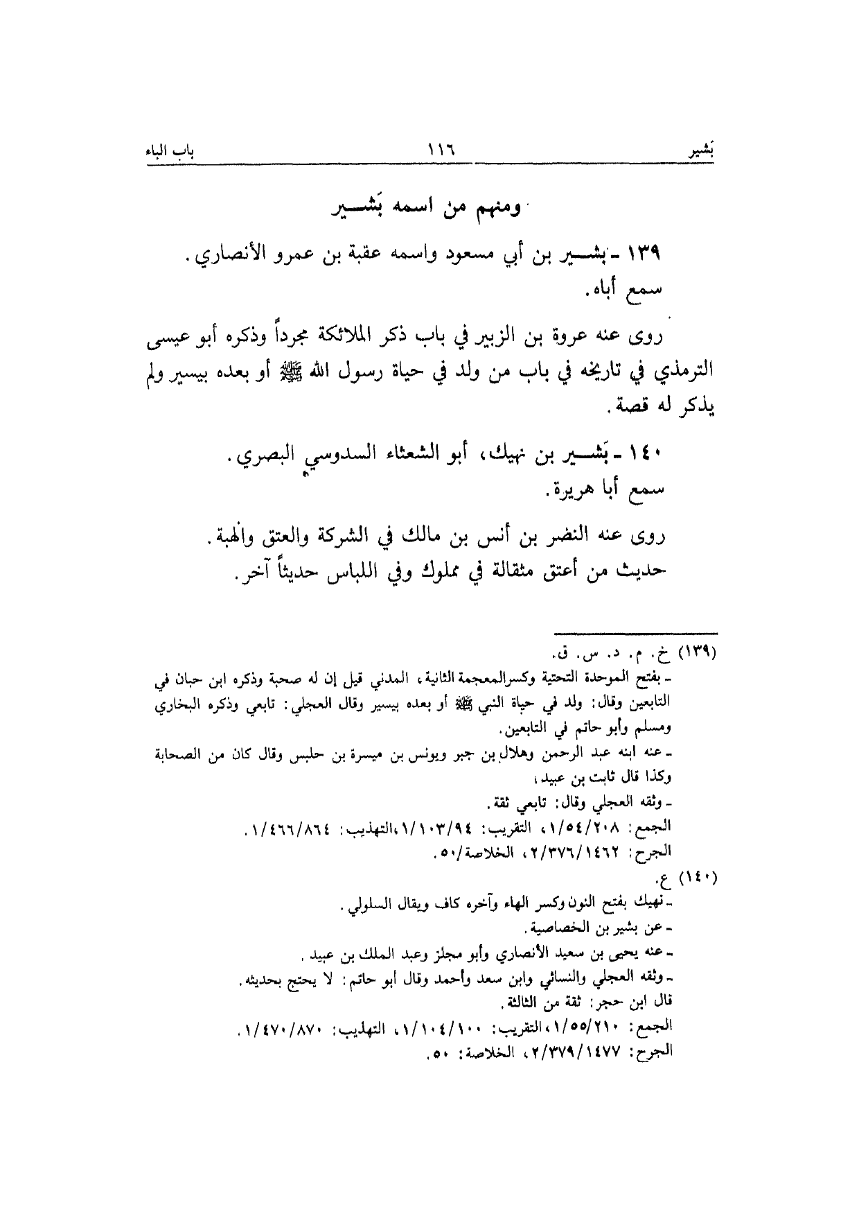 139 - بشير بن أبي مَسْعُود واسْمه عقبَة بن عَمْرو الْأنْصَارِيّ سمع أَبَاهُ رَوَى عَنهُ عَنهُ عُرْوَة بن الزبير فِي بَاب ذكر الْمَلَائِكَة مُجَردا وَذكره أَبُو عِيسَى التِّرْمِذِيّ فِي تَارِيخه فِي بَاب من ولد فِي حَيَاة رَسُول الله صَلَّى الله عَلَيْهِ وَسلم أَو بعده بِيَسِير وَلم يذكر لَهُ قصَّة
