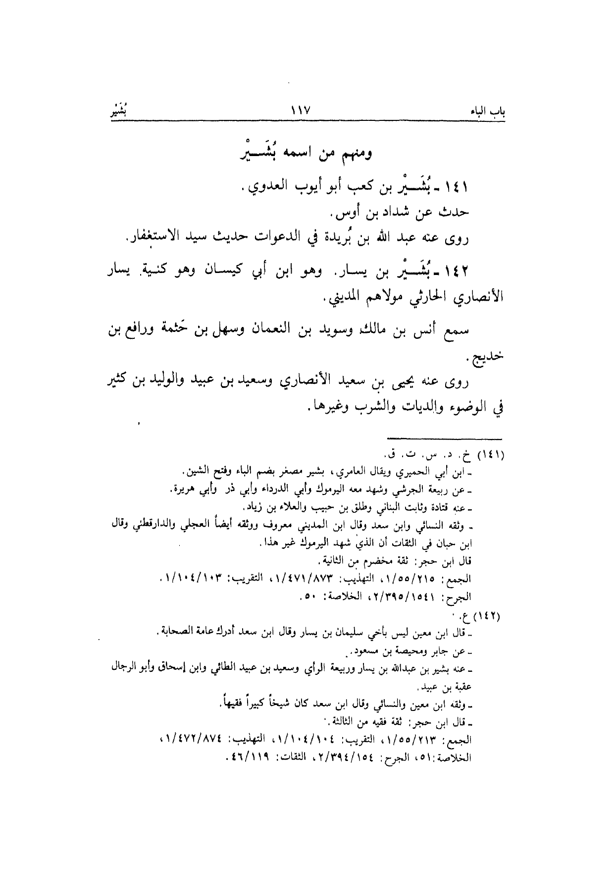 142 - بشير بن يسَار وَهُوَ ابْن أبي كيسَان وَهُوَ كنية يسَار الْأنْصَارِيّ الْحَارِثِيّ مَوْلَاهُم الْمَدِينِيّ سمع أنس بن مَالك وسُويد بن النُّعْمَان وَسَهل بن حثْمَة وَرَافِع بن خديج رَوَى عَنهُ يَحْيَى بن سعيد الْأنْصَارِيّ وَسَعِيد بن عبيد والوليد بن كثير فِي الْوضُوء والديات وَالشرب وَغَيرهَا