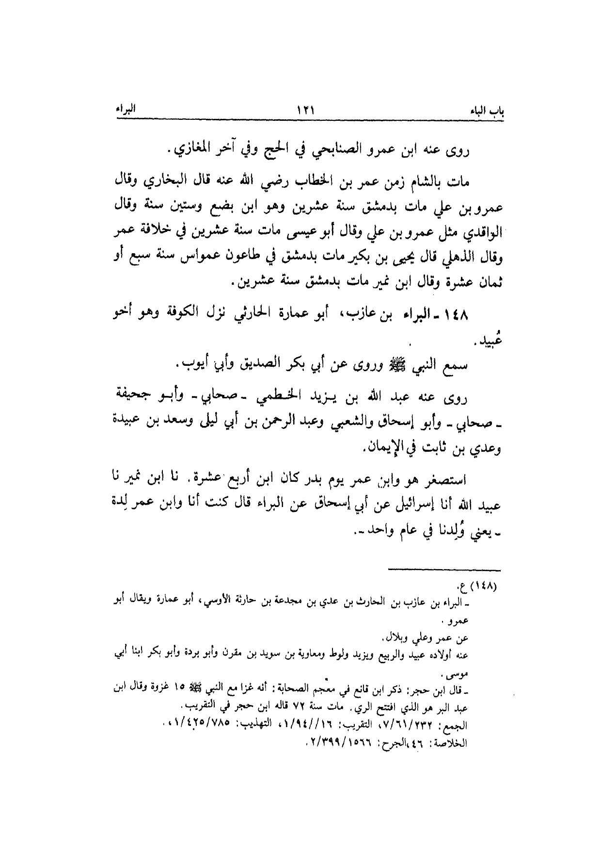 148 - الْبَراء بن عَازِب أَبُو عمَارَة الْحَارِثِيّ نزل الْكُوفَة وَهُوَ أَخُو عبيد سمع النَّبِي صَلَّى الله عَلَيْهِ وَسلم وَرَوَى عَن أبي بكر الصّديق وَأبي أَيُّوب رَوَى عَنهُ عبد الله بن يزِيد الخطمي صَحَابِيّ وَأَبُو جُحَيْفَة صَحَابِيّ وَأَبُو إِسْحَاق وَالشعْبِيّ وَعبد الرَّحْمَن بن أبي لَيْلَى وَسعد بن عُبَيْدَة وعدي بن ثَابت فِي الْإِيمَان استصغر هُوَ وَابْن عمر يَوْم بدر كَانَ ابْن أَربع عشرَة نَا ابْن نمير نَا عبيد الله أَنا إِسْرَائِيل عَن أبي إِسْحَاق عَن الْبَراء قَالَ كنت أَنا وَابْن عمر لِدَة يَعْنِي ولد نَا فِي عَام وَاحِد