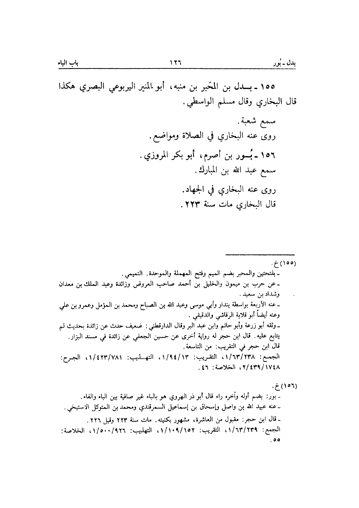 155 - بدل بن المحبر بن مُنَبّه أَبُو الْمُنِير الْيَرْبُوعي الْبَصْرِيّ هَكَذَا قَالَ البُخَارِيّ وَقَالَ مُسلم الوَاسِطِيّ سمع شُعْبَة رَوَى عَنهُ عَنهُ البُخَارِيّ فِي الصَّلَاة ومواضع