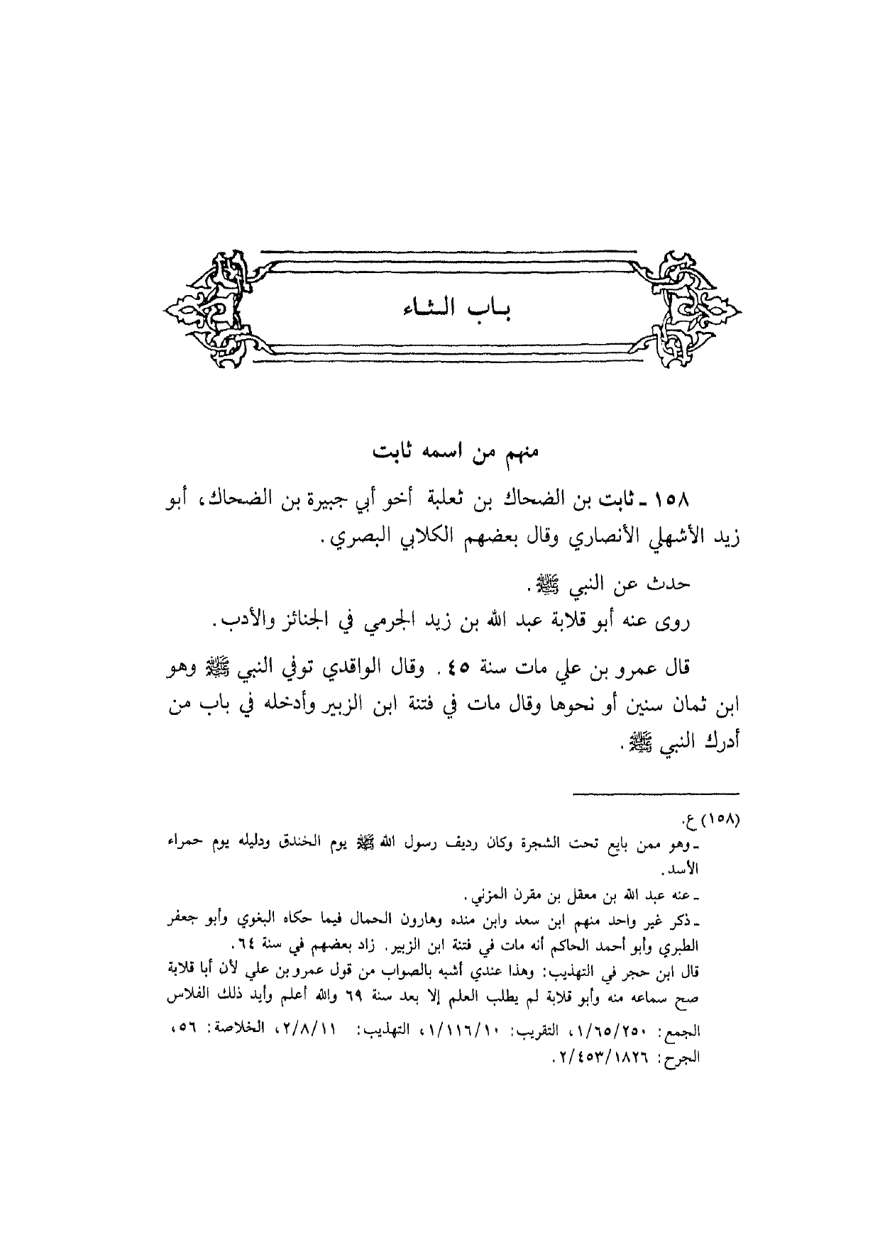 158 ثَابت بن الضَّحَّاك بن ثَعْلَبَة أَخُو أبي جبيرَة بن الضَّحَّاك أَبُو زيد الشهلي الْأنْصَارِيّ وَقَالَ بَعضهم الْكلابِي الْبَصْرِيّ حدث عَن النَّبِي صَلَّى الله عَلَيْهِ وَسلم رَوَى عَنهُ أَبُو قلَابَة عبد الله بن زيد الْجرْمِي فِي الْجَنَائِز وَالْأَدب قَالَ عَمْرو بن عَلّي مَاتَ سنة 45 وَقَالَ الْوَاقِدِيّ توفّي النَّبِي صَلَّى الله عَلَيْهِ وَسلم وَهُوَ ابْن ثَمَان سِنِين أَو نَحْوهَا وَقَالَ مَاتَ فِي فتْنَة ابْن الزبير وَأدْخلهُ فِي بَاب من أدْرك النَّبِي صَلَّى الله عَلَيْهِ وَسلم