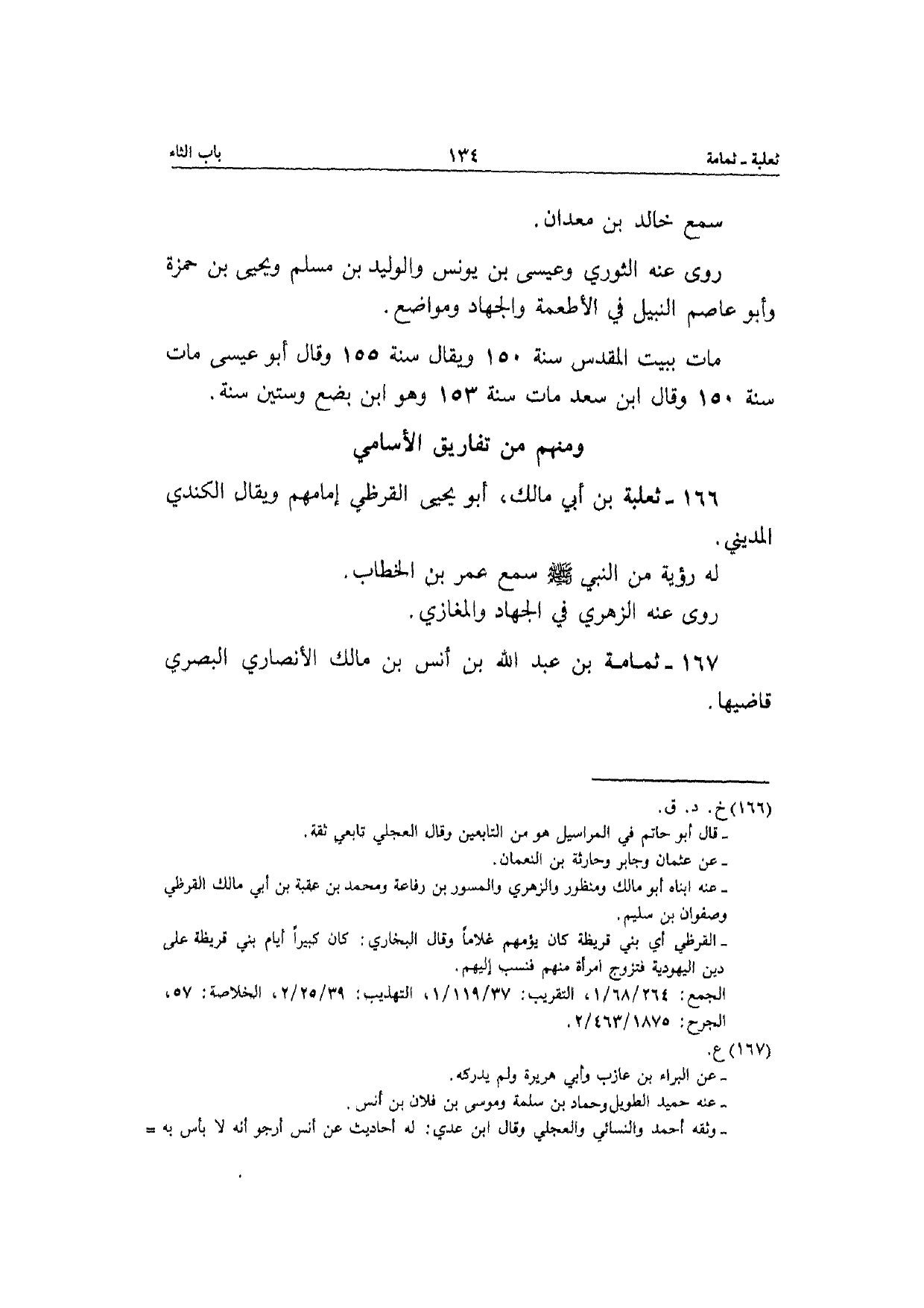 166 - ثَعْلَبَة بن أبي مَالك أَبُو يَحْيَى الْقرظِيّ إمَامهمْ وَيُقَال الْكِنْدِيّ الْمَدِينِيّ لَهُ رُؤْيَة من النَّبِي صَلَّى الله عَلَيْهِ وَسلم سمع عمر بن الْخطاب رَوَى عَنهُ عَنهُ الزُّهْرِيّ فِي الْجِهَاد والمغازي
