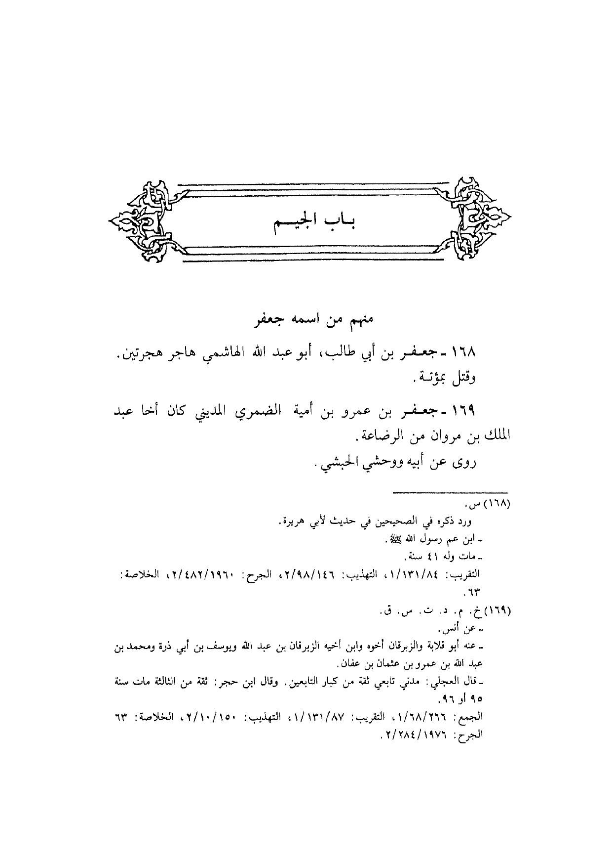 169 - جَعْفَر بن عَمْرو بن أُميَّة الضمرِي الْمَدِينِيّ كَانَ أَخا عبد الْملك بن مَرْوَان من الرضَاعَة رَوَى عَن أَبِيه وَوَحْشِي الحبشي