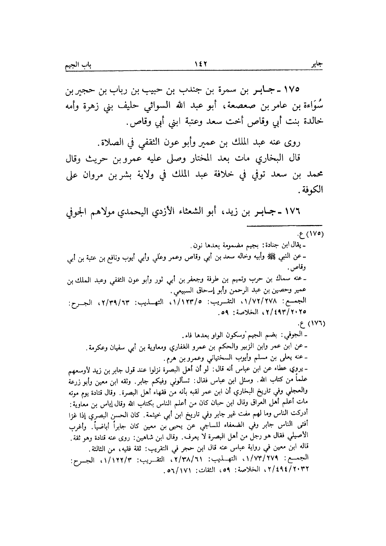 175 - جَابر بن سَمُرَة بن جُنْدُب بن حبيب بن ربَاب بن حُجَيْر بن سواءة بن عَامر بن صعصعة أَبُو عبد الله السوَائِي حَلِيف بني زهرَة وَأمه خالدة بنت أبي وَقاص أُخْت سعد وَعتبَة ابْني أبي وَقاص رَوَى عَنهُ عبد الْملك بن عُمَيْر وَأَبُو عون الثَّقَفِيّ فِي الصَّلَاة