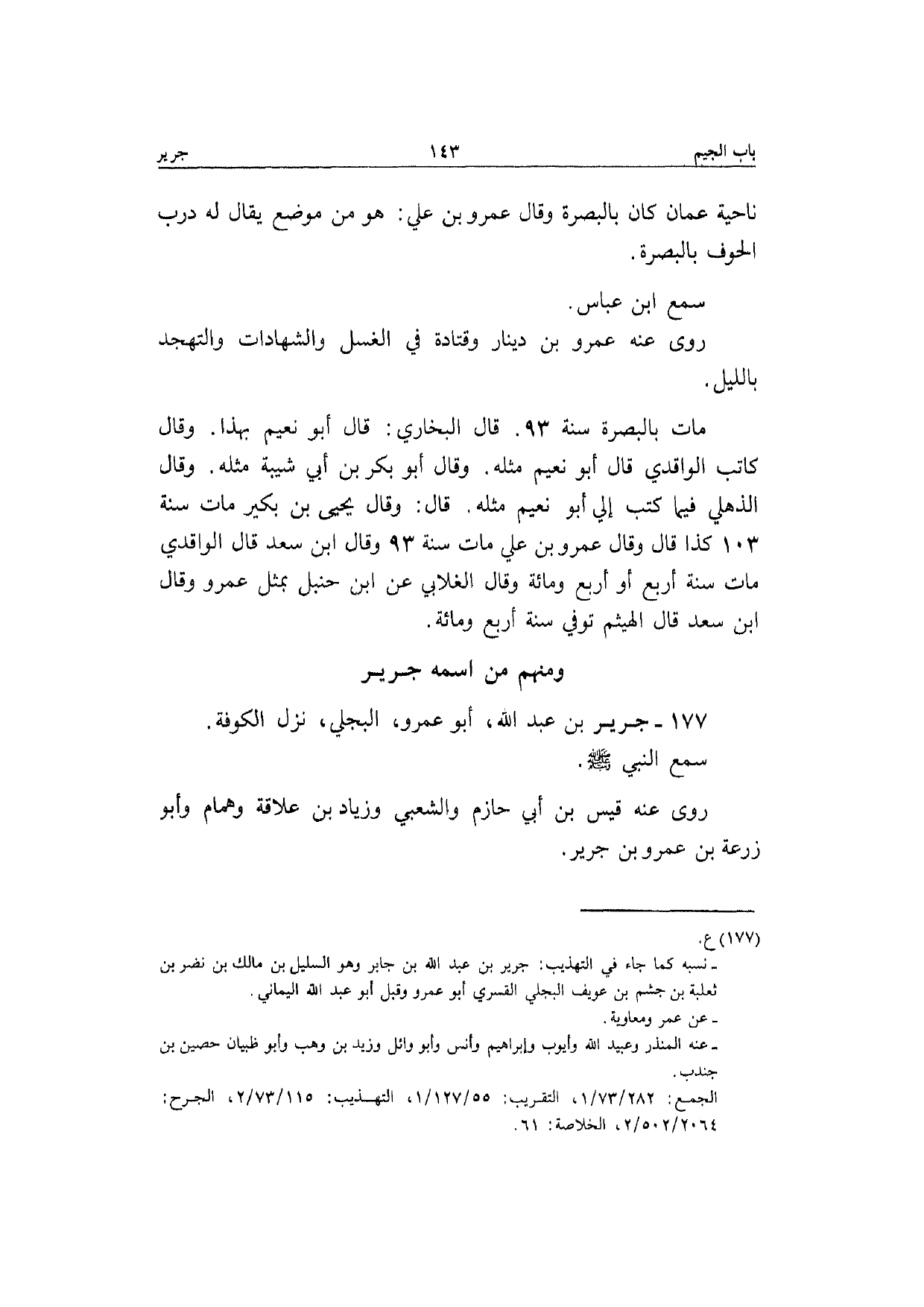 177 - جرير بن عبد الله أَبُو عَمْرو البَجلِيّ نزل الْكُوفَة سمع النَّبِي صَلَّى الله عَلَيْهِ وَسلم رَوَى عَنهُ قيس بن أبي حَازِم وَالشعْبِيّ وَزِيَاد بن علاقَة وَهَمَّام وَأَبُو زرْعَة بن عَمْرو بن جرير