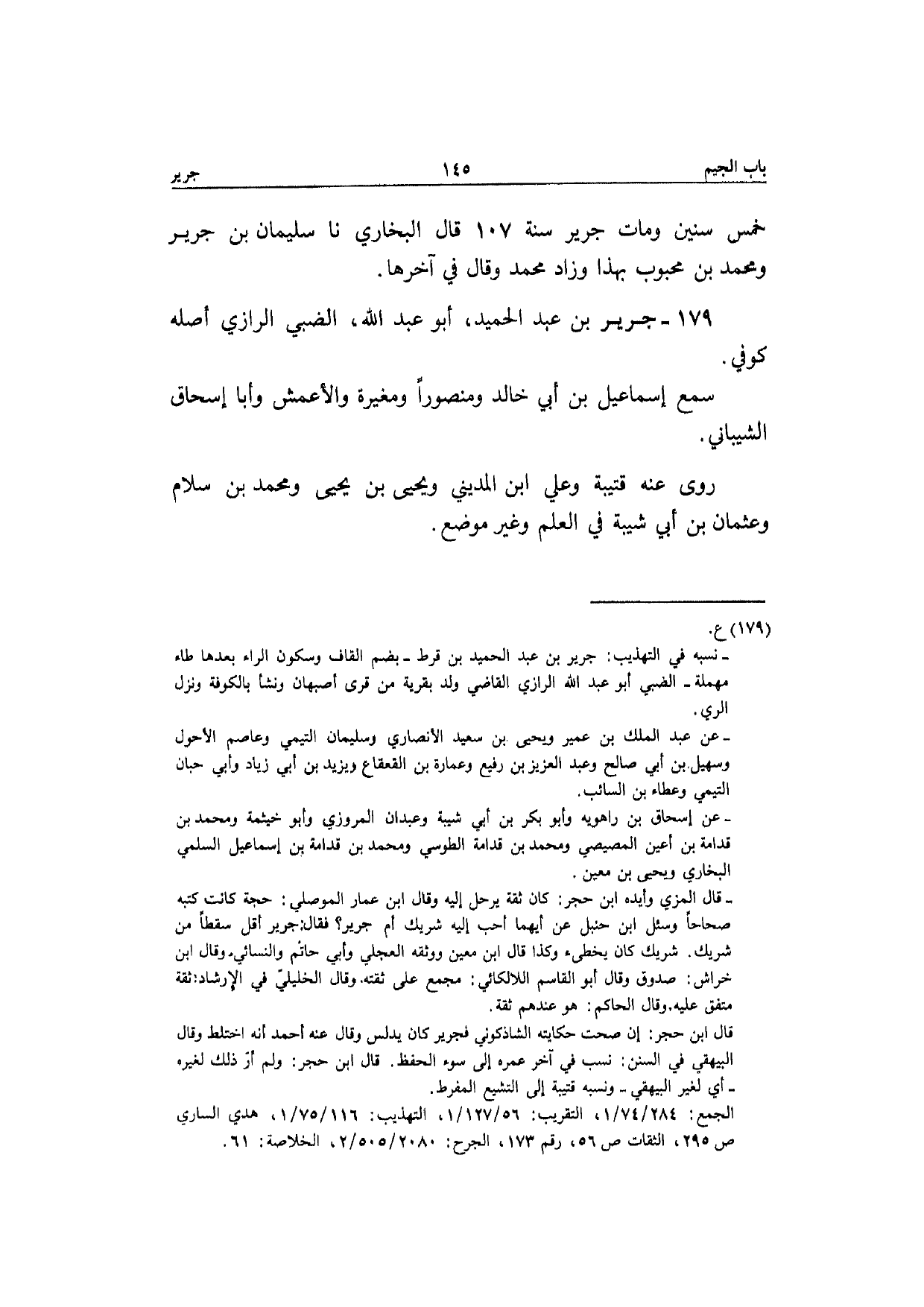 179 - جرير بن عبد الحميد أَبُو عبد الله الضَّبِّيّ الرَّازِيّ أَصله كُوفِي سمع إِسْمَاعِيل بن أبي خَالِد ومنصورا ومغيرة وَالْأَعْمَش وَأَبا إِسْحَاق الشَّيْبَانِيّ رَوَى عَنهُ عَنهُ قُتَيْبَة وَعَلَى ابْن الْمَدِينِيّ وَيَحْيَى بن يَحْيَى وَمُحَمّد بن سَلام وَعُثْمَان بن أبي شيبَة فِي الْعلم وَغير مَوضِع