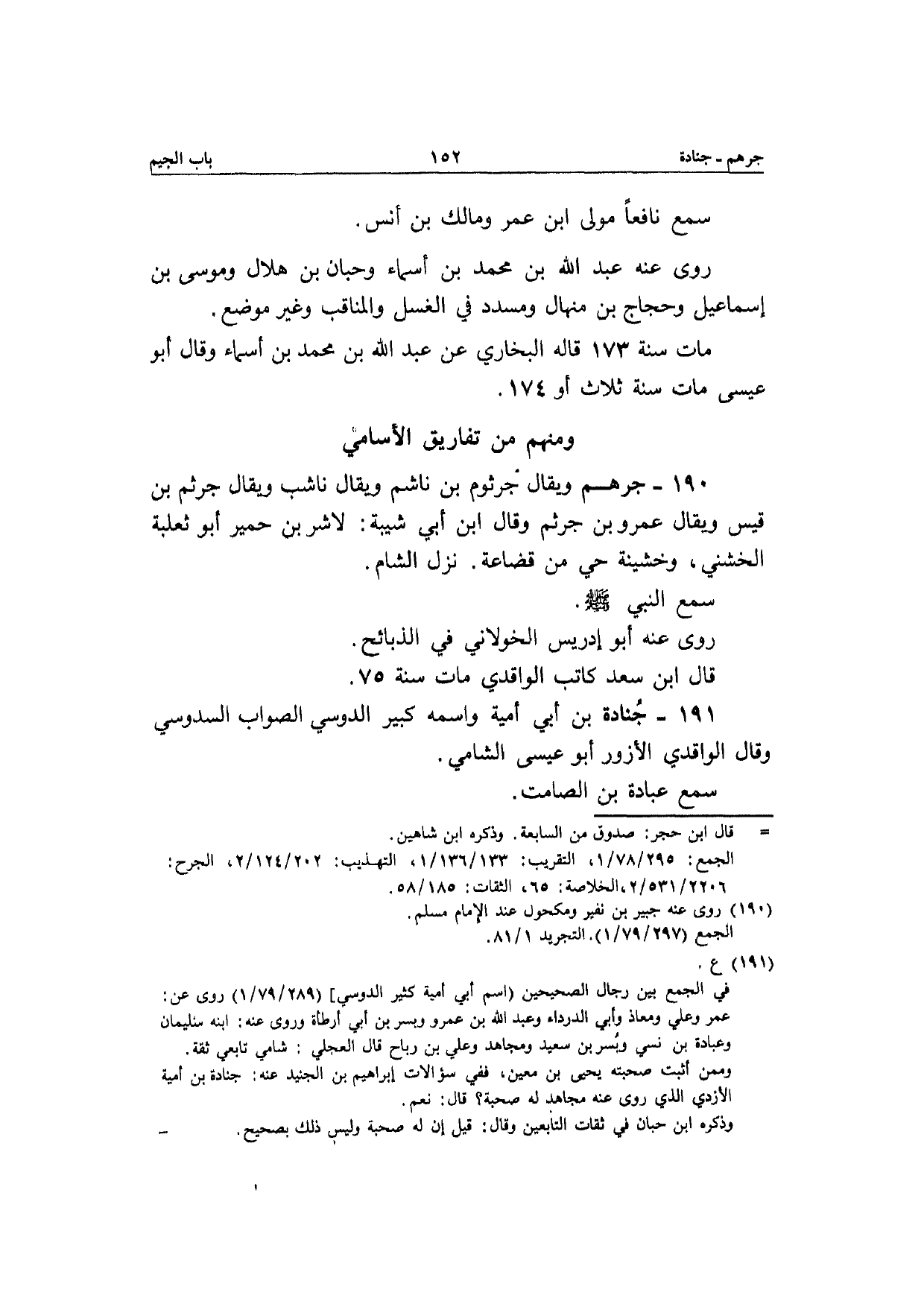 191 - جُنَادَة بن أبي أُميَّة واسْمه كَبِير الدوسي الصَّوَاب السدُوسِي وَقَالَ الْوَاقِدِيّ الْأَزْوَر أَبُو عِيسَى الشَّامي سمع عبَادَة بن الصَّامِت