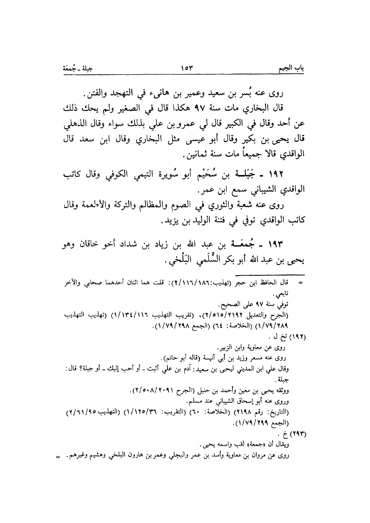 192 - جبلة بن سحيم أَبُو سويرة التَّيْمِيّ الْكُوفِي وَقَالَ كَاتب الْوَاقِدِيّ الشَّيْبَانِيّ سمع ابْن عمر رَوَى عَنهُ شُعْبَة وَالثَّوْري فِي الصَّوْم والمظالم والتركة والأطعمة وَقَالَ كَاتب الْوَاقِدِيّ توفّي فِي فتْنَة الْوَلِيد بن يزِيد