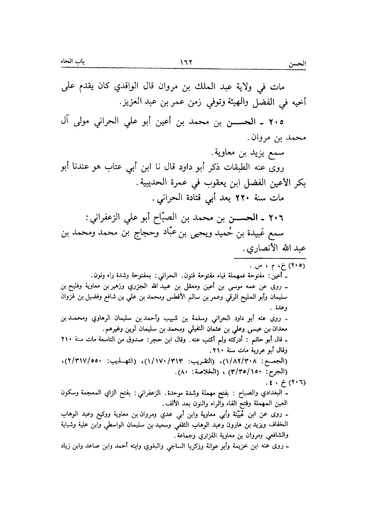205 - الْحسن بن مُحَمَّد بن أعين أَبُو عَلّي الْحَرَّانِي مولَى آل مُحَمَّد بن مَرْوَان سمع يزِيد بن مُعَاوِيَة رَوَى عَنهُ الطَّبَقَات ذكر أَبُو دَاوُد قَالَ نَا ابْن أبي عتاب هُوَ عندنَا أَبُو بكر الْأَعْين الْفضل بن يَعْقُوب فِي عمْرَة الْحُدَيْبِيَة مَاتَ سنة 220 بعد أبي قَتَادَة الْحَرَّانِي