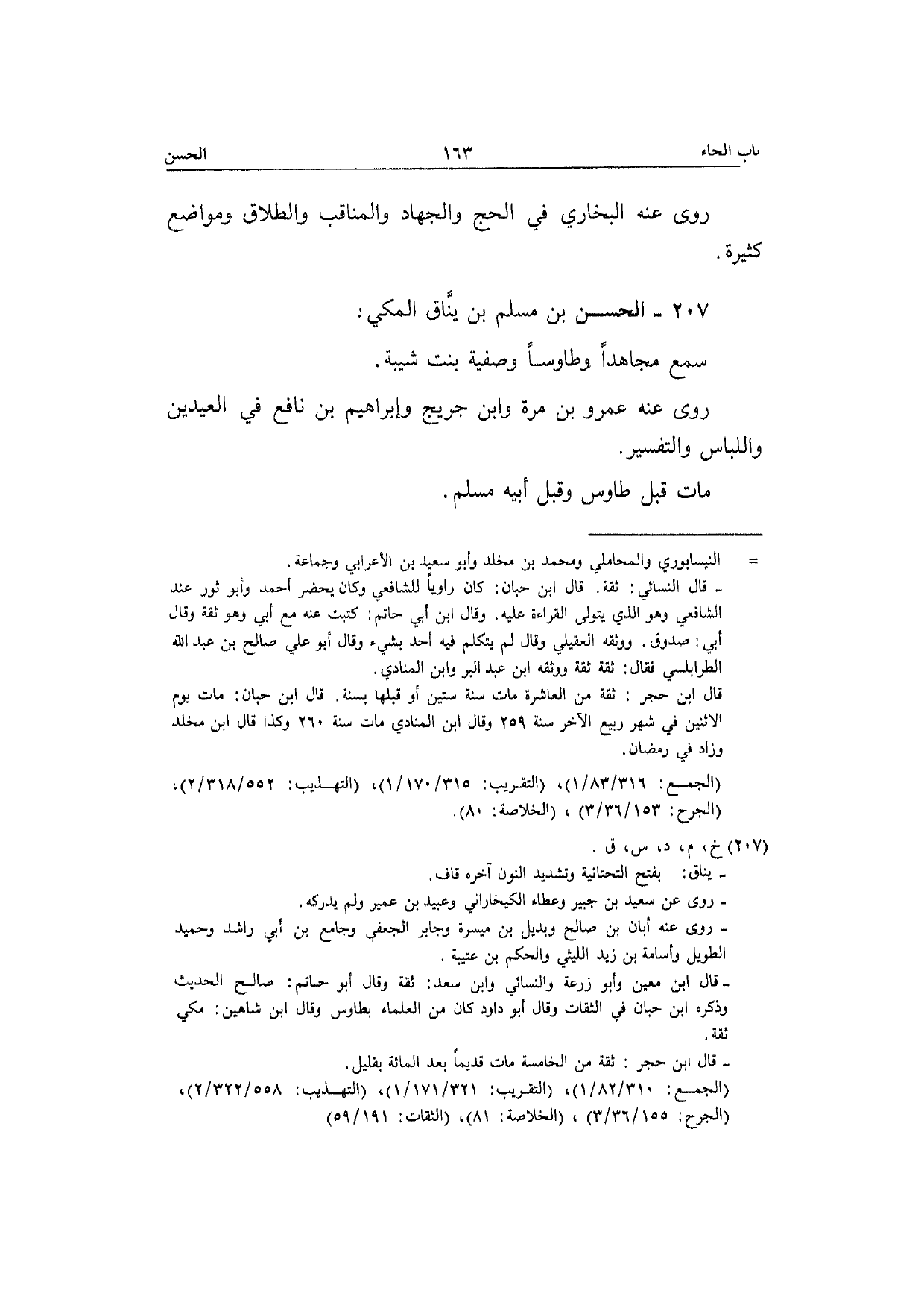 207 - الْحسن بن مُسلم بن يناق الْمَكِّيّ سمع مُجَاهدًا وطاوسا وَصفِيَّة بنت شيبَة رَوَى عَنهُ عَمْرو بن مرّة وَابْن جريج وَإِبْرَاهِيم بن نَافِع فِي الْعِيدَيْنِ واللباس وَالتَّفْسِير مَاتَ قبل طَاوس وَقبل أَبِيه مُسلم