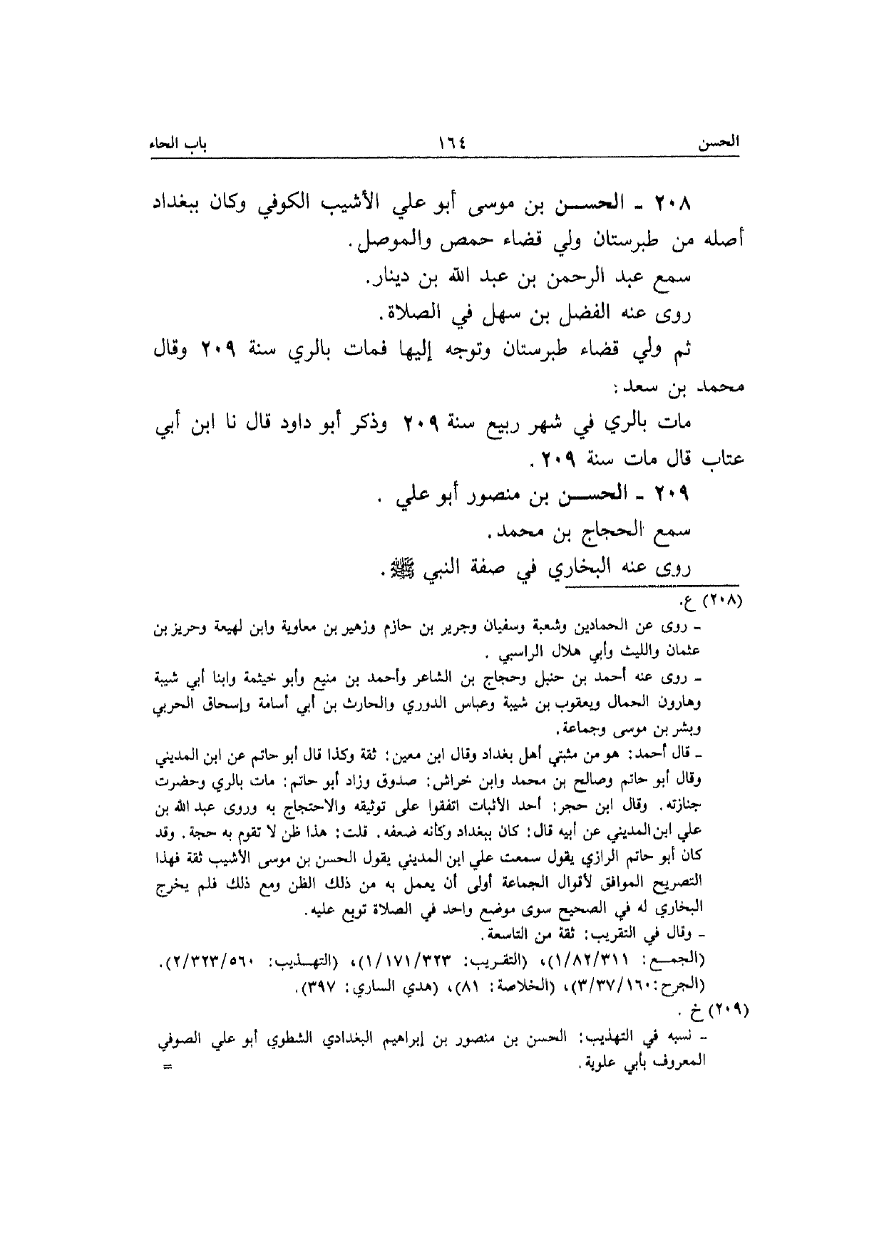 208 - الْحسن بن مُوسَى أَبُو عَلّي الأشيب الْكُوفِي وَكَانَ بِبَغْدَاد أَصله من طبرستان ولي قَضَاء حمص والموصل سمع عبد الرَّحْمَن بن عبد الله بن دِينَار رَوَى عَنهُ الْفضل بن سهل فِي الصَّلَاة ثمَّ ولي قَضَاء طبرستان وَتوجه إِلَيْهَا فَمَاتَ بِالريِّ سنة 209 وَقَالَ مُحَمَّد بن سعد مَاتَ بِالريِّ فِي شهر ربيع سنة 209 وَذكر أَبُو دَاوُد قَالَ نَا ابْن أبي عتاب قَالَ مَاتَ سنة 209