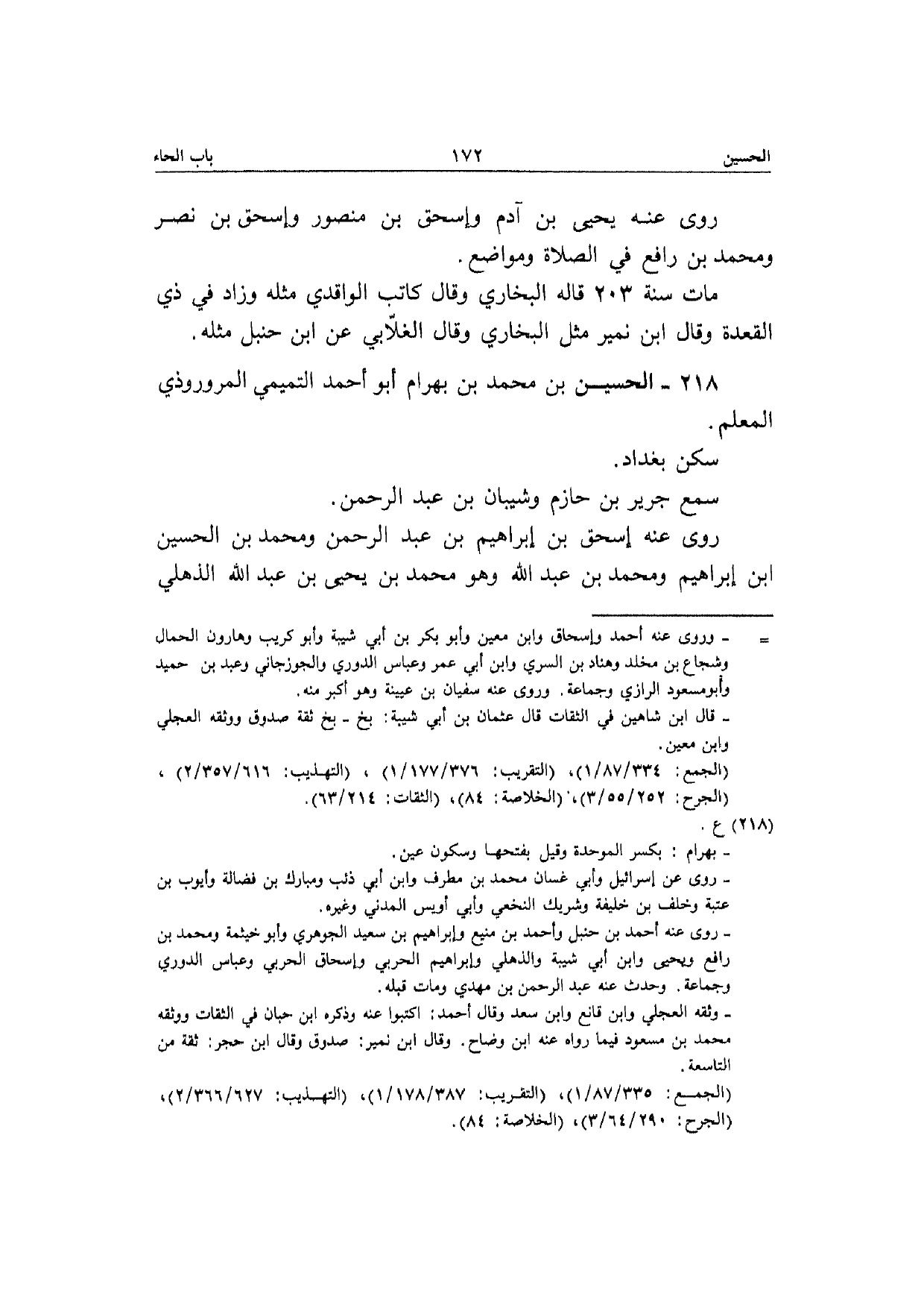218 - الْحُسَيْن بن مُحَمَّد بن بهْرَام أَبُو أَحْمد التَّمِيمِي المروروذي الْمعلم سكن بَغْدَاد سمع جرير بن حَازِم وشيبان بن عبد الرَّحْمَن رَوَى عَنهُ عَنهُ إِسْحَق بن إِبْرَاهِيم بن عبد الرَّحْمَن وَمُحَمّد بن الْحُسَيْن بن إِبْرَاهِيم وَمُحَمّد بن عبد الله وَهُوَ مُحَمَّد بن يَحْيَى بن عبد الله الذهلي