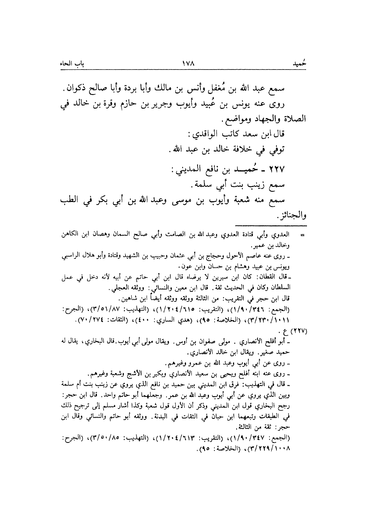 227 - حميد بن نَافِع الْمَدِينِيّ سمع زَيْنَب بنت أبي سَلمَة سمع مِنْهُ شُعْبَة وَأَيوب بن مُوسَى وَعبد الله بن أبي بكر فِي الطِّبّ والجنائز