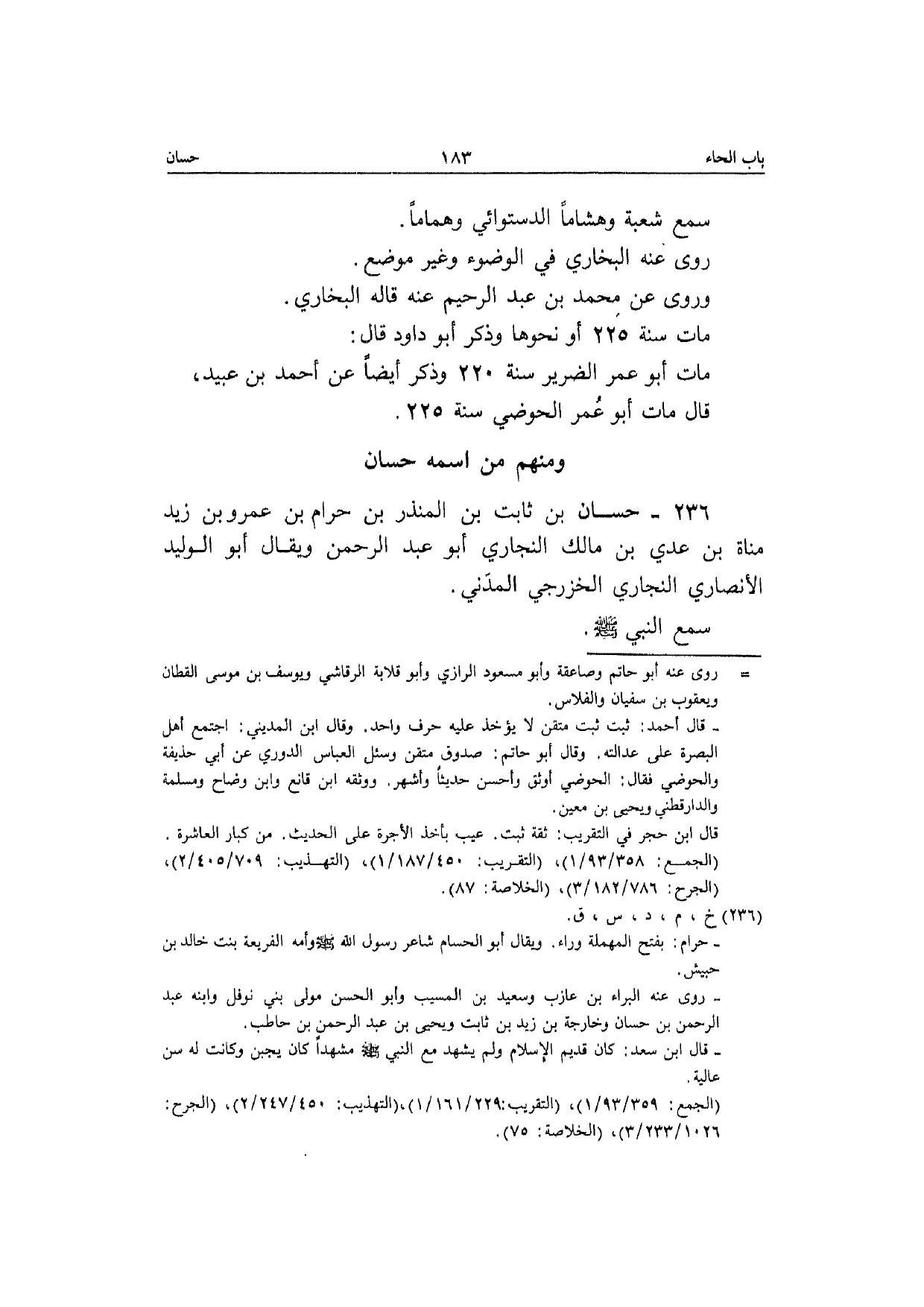 26 - حسان بن ثَابت بن الْمُنْذر بن حرَام بن عَمْرو بن زيد مَنَاة بن عدي بن مَالك النجاري أَبُو عبد الرَّحْمَن وَيُقَال أَبُو الْوَلِيد الْأنْصَارِيّ النجاري الخزرجي الْمدنِي سمع النَّبِي صَلَّى الله عَلَيْهِ وَسلم