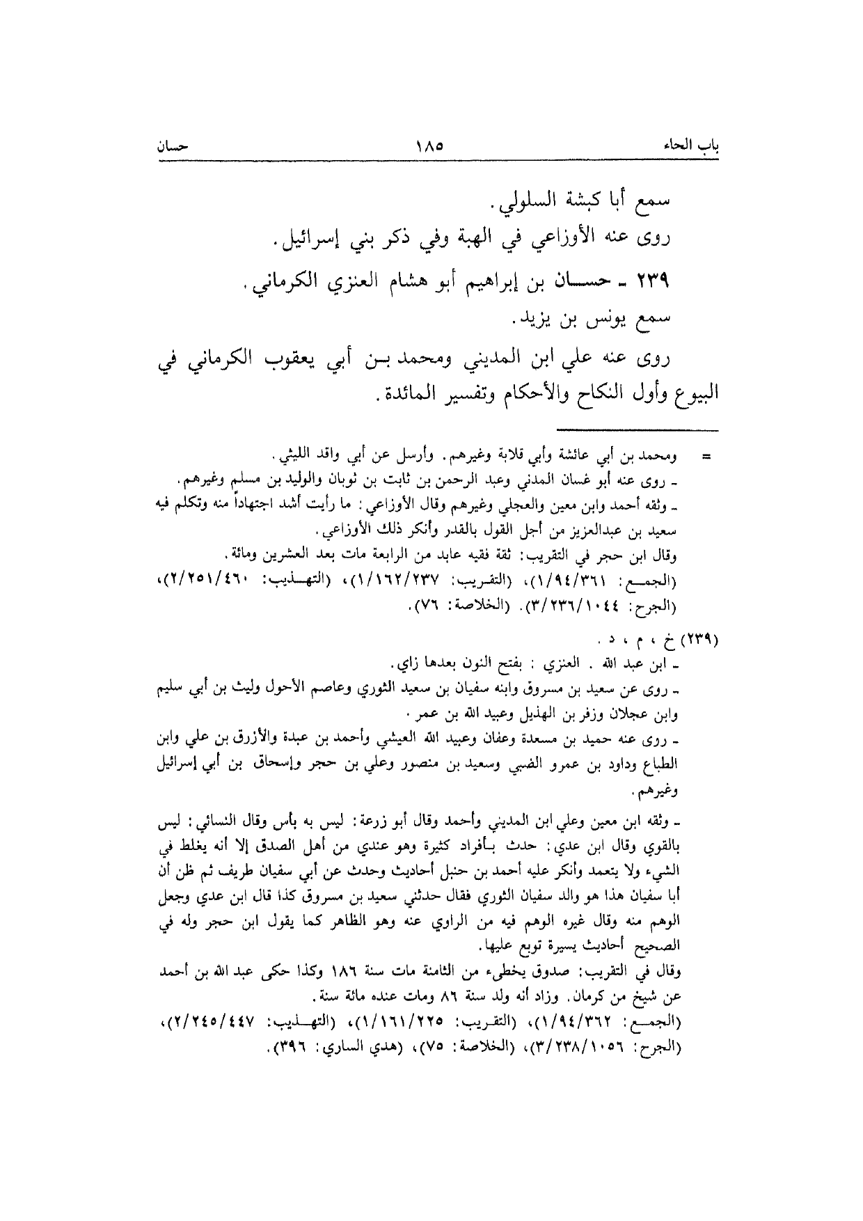 239 - حسان بن إِبْرَاهِيم أَبُو هِشَام الْعَنزي الْكرْمَانِي سمع يُونُس بن يزِيد رَوَى عَنهُ عَلّي ابْن الْمَدِينِيّ وَمُحَمّد بن أبي يَعْقُوب الْكرْمَانِي فِي الْبيُوع وَأول النِّكَاح وَالْأَحْكَام وَتَفْسِير الْمَائِدَة