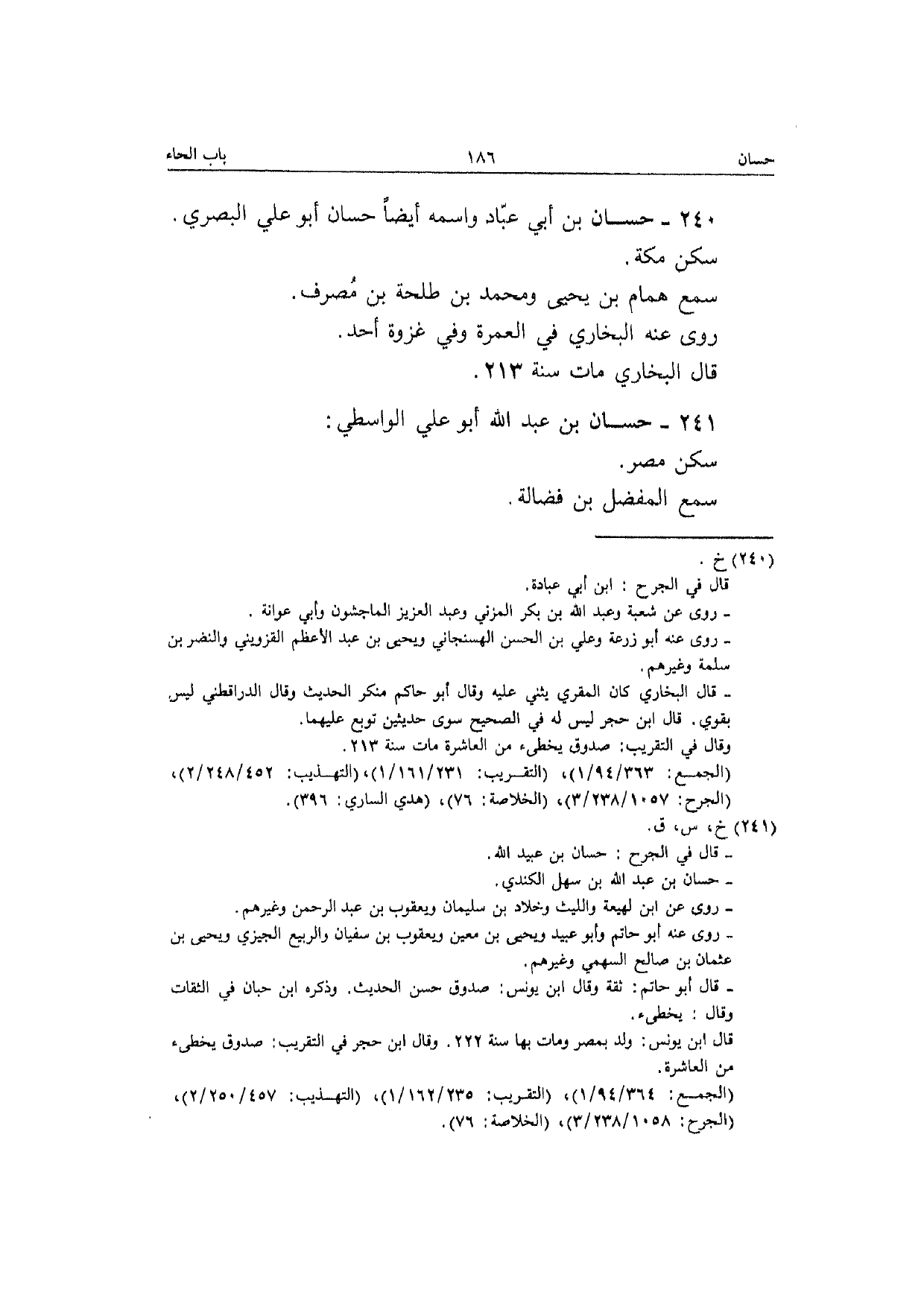 240 - حسان بن أبي عباد واسْمه أَيْضا حسان أَبُو عَلّي الْبَصْرِيّ سكن مَكَّة سمع همام بن يَحْيَى وَمُحَمّد بن طَلْحَة بن مصرف رَوَى عَنهُ البُخَارِيّ فِي الْعمرَة وَفِي غَزْوَة أحد قَالَ البُخَارِيّ مَاتَ سنة 213