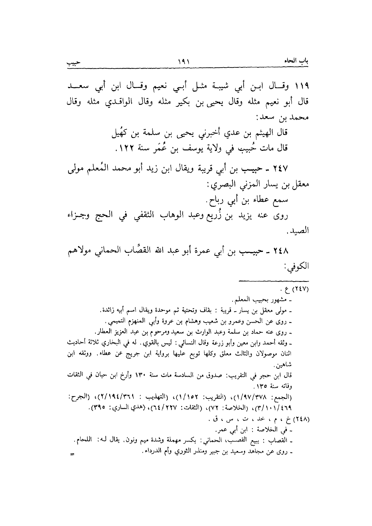 119 - وَقَالَ ابْن أبي شيبَة مثل أبي نعيم وَقَالَ ابْن أبي سعد قَالَ أَبُو نعيم مثله وَقَالَ يَحْيَى بن بكير مثله وَقَالَ الْوَاقِدِيّ مثله وَقَالَ مُحَمَّد بن سعد قَالَ الْهَيْثَم بن عدي أَخْبرنِي يَحْيَى بن أُسَامَة بن كهيل قَالَ مَاتَ حبيب فِي ولَايَة يُوسُف بن عمر سنة 122