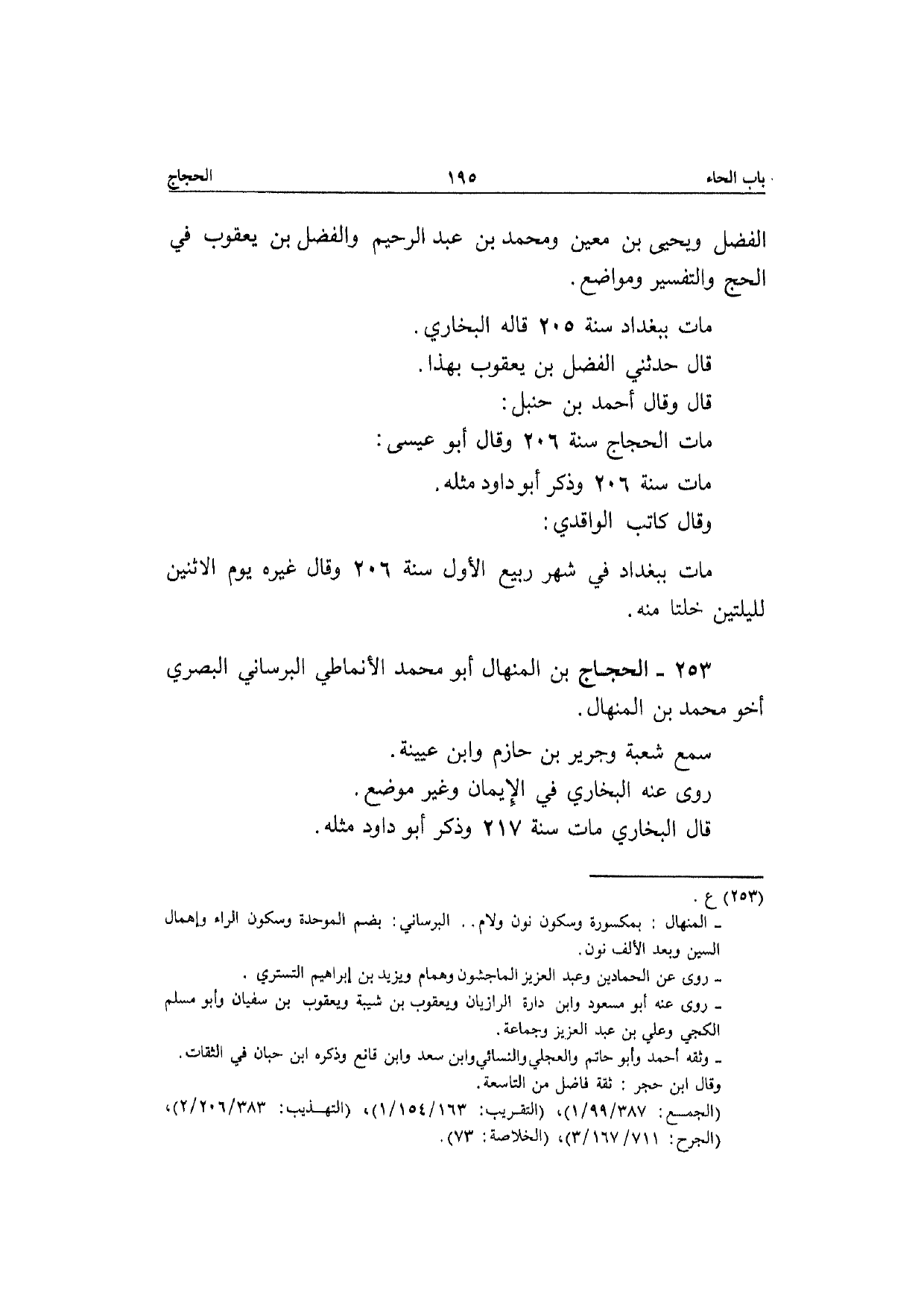 253 - الْحجَّاج بن الْمنْهَال أَبُو مُحَمَّد الْأنمَاطِي البرْسَانِي الْبَصْرِيّ أَخُو مُحَمَّد بن الْمنْهَال سمع شُعْبَة وَجَرِير بن حَازِم وَابْن عُيَيْنَة رَوَى عَنهُ البُخَارِيّ فِي الْإِيمَان وَغير مَوضِع قَالَ البُخَارِيّ مَاتَ سنة 217 وَذكر أَبُو دَاوُد مثله