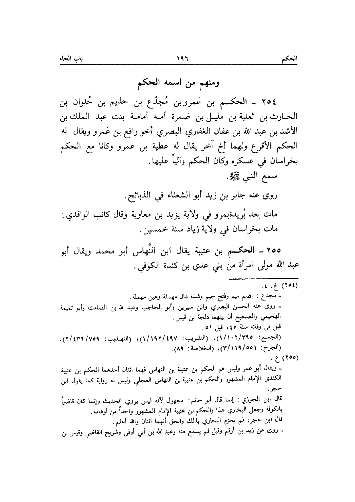 254 - الحكم بن عَمْرو بن مجدع بن حذيم بن حلوان بن الْحَارِث بن ثَعْلَبَة بن مليل بن ضَمرَة أمه أُمَامَة بنت عبد الْملك بن الأشد بن عبد الله بن عَفَّان الْغِفَارِيّ الْبَصْرِيّ أَخُو رَافع بن عَمْرو وَيُقَال لَهُ الحكم الْأَقْرَع وَلَهُمَا أَخ آخر يُقَال لَهُ عَطِيَّة بن عَمْرو وَكَانَا مَعَ الحكم بخراسان فِي عسكره وَكَانَ الحكم واليا عَلَيْهَا سمع النَّبِي صَلَّى الله عَلَيْهِ وَسلم رَوَى عَنهُ جَابر بن زيد أَبُو الشعْثَاء فِي الذَّبَائِح مَاتَ بعد بُرَيْدَة بمرو فِي ولَايَة يزِيد بن مُعَاوِيَة وَقَالَ كَاتب الْوَاقِدِيّ مَاتَ بخراسان فِي ولَايَة زِيَاد سنة خسمين
