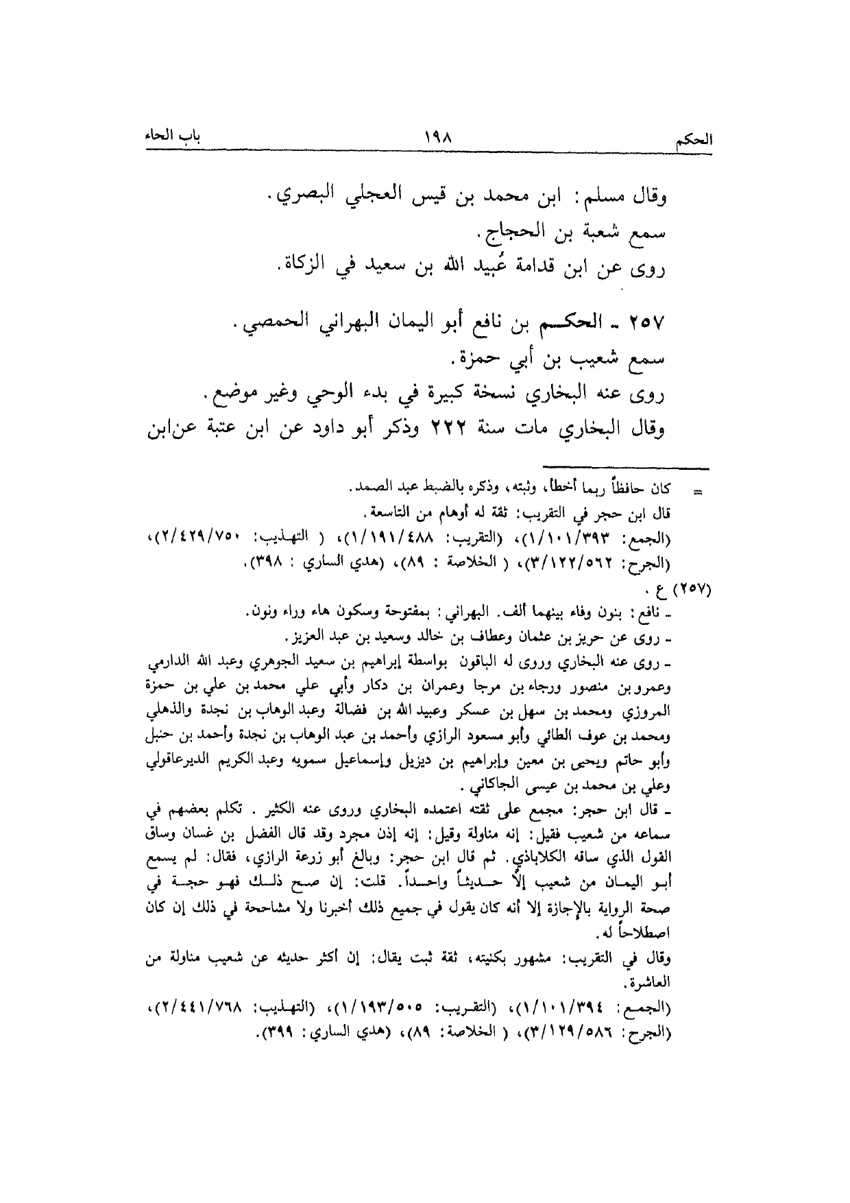257 - الحكم بن نَافِع أَبُو الْيَمَان البهراني الْحِمصِي سمع شُعَيْب بن أبي حَمْزَة رَوَى عَنهُ البُخَارِيّ نُسْخَة كَبِيرَة فِي بَدْء الْوَحْي وَغير مَوضِع وَقَالَ البُخَارِيّ مَاتَ سنة 222 وَذكر أَبُو دَاوُد عَن ابْن عتبَة عَن ابْن