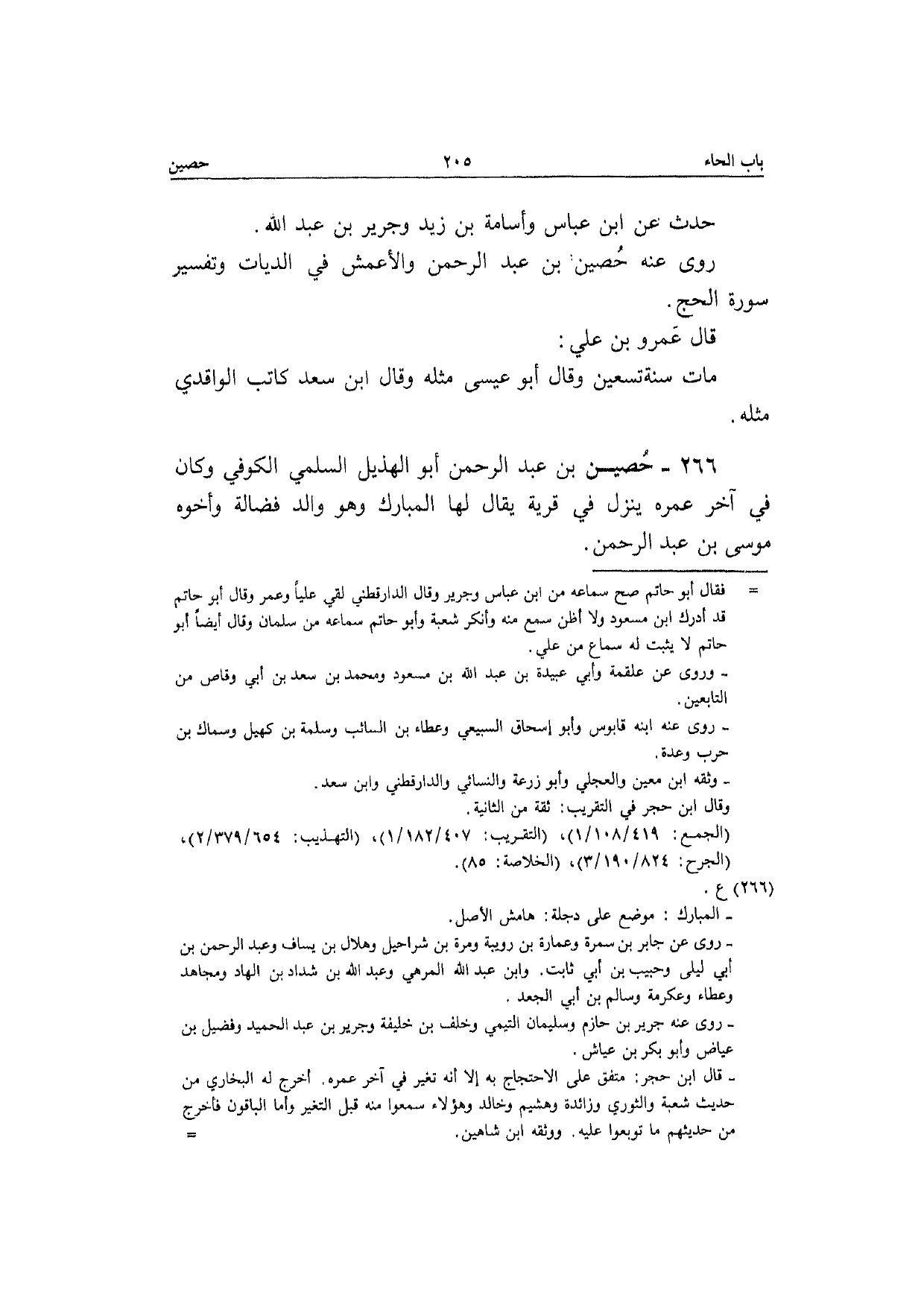 266 - حُصَيْن بن عبد الرَّحْمَن أَبُو الْهُذيْل السّلمِيّ الْكُوفِي وَكَانَ فِي آخر عمره ينزل فِي قَرْيَة يُقَال لَهَا الْمُبَارك وَهُوَ وَالِد فضَالة وَأَخُوهُ مُوسَى بن عبد الرَّحْمَن