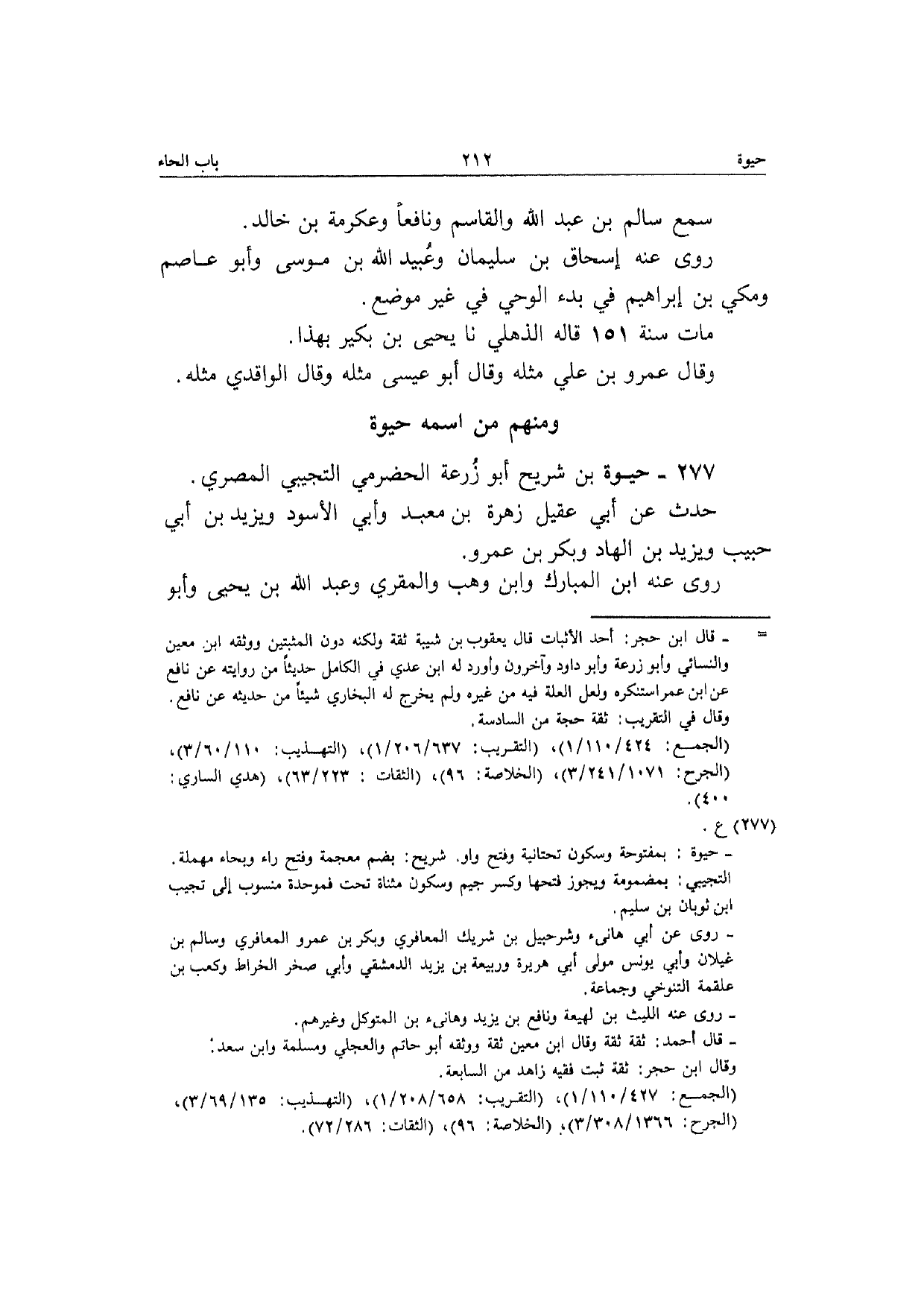 277 - حَيْوَة بن شُرَيْح أَبُو زرْعَة الْحَضْرَمِيّ التجِيبِي الْمصْرِيّ حدث عَن أبي عقيل زهرَة بن معبد وَأبي الْأسود وَيزِيد بن أبي حبيب وَيزِيد بن الْهَاد وَبكر بن عَمْرو رَوَى عَنهُ ابْن الْمُبَارك وَابْن وهب والمقري وَعبد الله بن يَحْيَى وَأَبُو