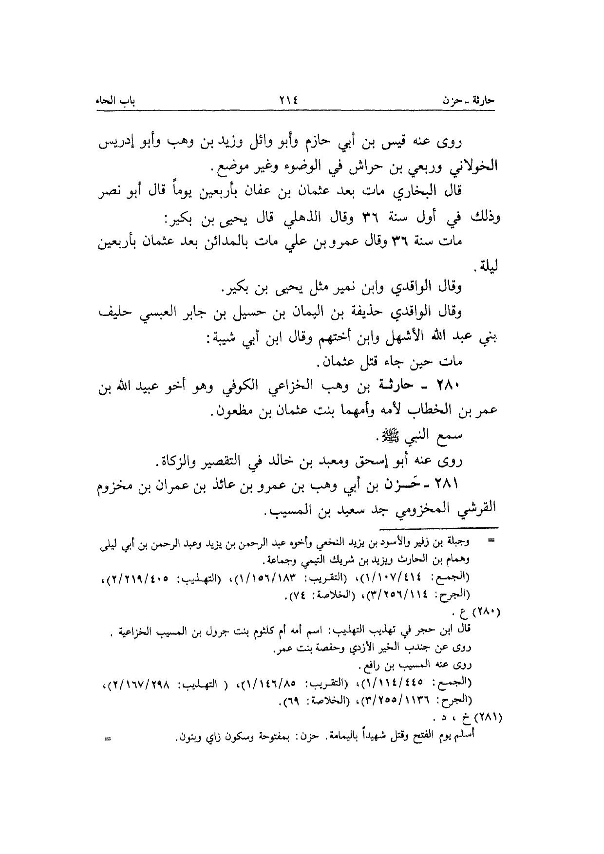 280 - حَارِثَة بن وهب الْخُزَاعِيّ الْكُوفِي وَهُوَ أَخُو عبيد الله بن عمر بن الْخطاب لأمه وأمهما بنت عُثْمَان بن مَظْعُون سمع النَّبِي صَلَّى الله عَلَيْهِ وَسلم رَوَى عَنهُ أَبُو إِسْحَق ومعبد بن خَالِد فِي التَّقْصِير وَالزَّكَاة