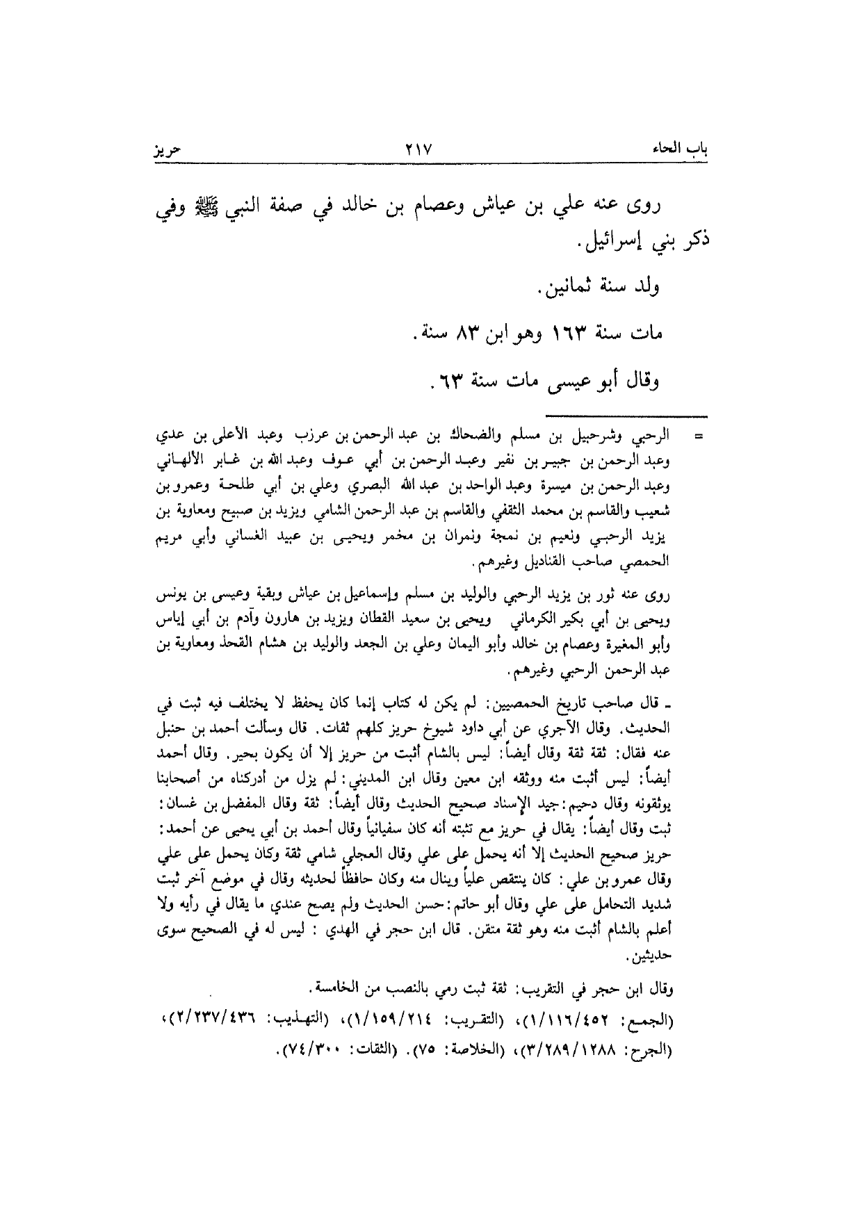 رَوَى عَنهُ عَلّي بن عَيَّاش وعصام بن خَالِد فِي صفة النَّبِي صَلَّى الله عَلَيْهِ وَسلم وَفِي ذكر بني إِسْرَائِيل ولد سنة ثَمَانِينَ مَاتَ سنة 163 وَهُوَ ابْن 83 سنة وَقَالَ أَبُو عِيسَى مَاتَ سنة 63