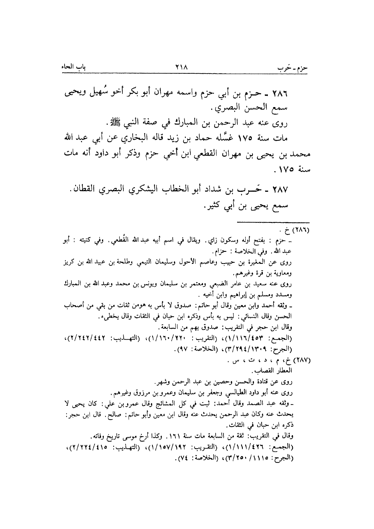 286 - حزم بن أبي حزم واسْمه مهْرَان أَبُو بكر أَخُو سُهَيْل وَيَحْيَى سمع الْحسن الْبَصْرِيّ رَوَى عَنهُ عبد الرَّحْمَن بن الْمُبَارك فِي صفة النَّبِي صَلَّى الله عَلَيْهِ وَسلم مَاتَ سنة 175 غسله حَمَّاد بن زيد قَالَه البُخَارِيّ عَن أبي عبد الله مُحَمَّد بن يَحْيَى بن مهْرَان الْقطعِي ابْن أخي حزم وَذكر أَبُو دَاوُد انه مَاتَ سنة 175