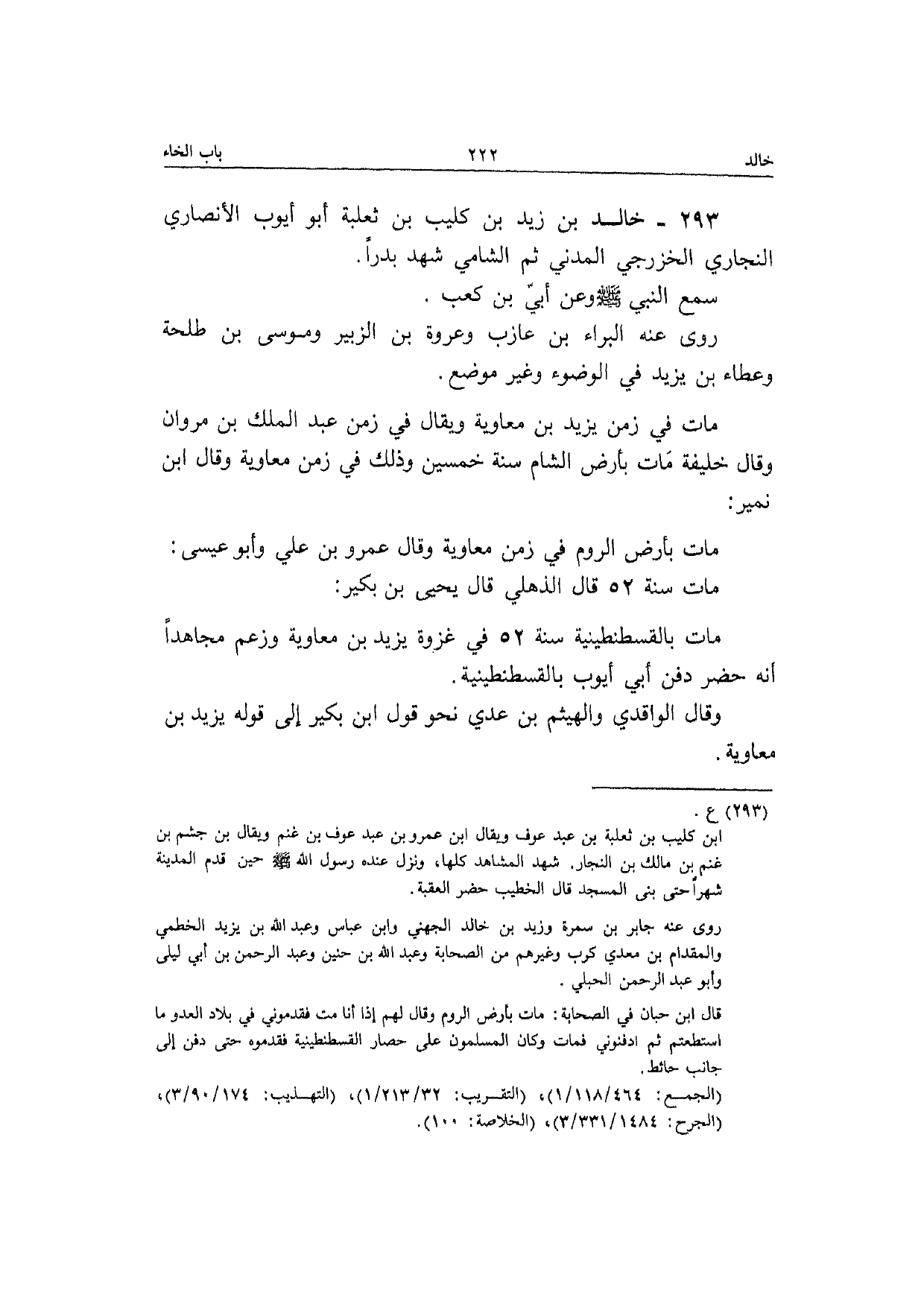 293 - خَالِد بن زيد بن كُلَيْب بن ثَعْلَبَة أَبُو أَيُّوب الْأنْصَارِيّ النجاري الخزرجي الْمدنِي ثمَّ الشَّامي شهد بَدْرًا سمع النَّبِي صَلَّى الله عَلَيْهِ وَسلم وَعَن أبي بن كَعْب رَوَى عَنهُ الْبَراء بن عَازِب وَعُرْوَة بن الزبير ومُوسَى بن طَلْحَة وَعَطَاء بن يزِيد فِي الْوضُوء وَغير