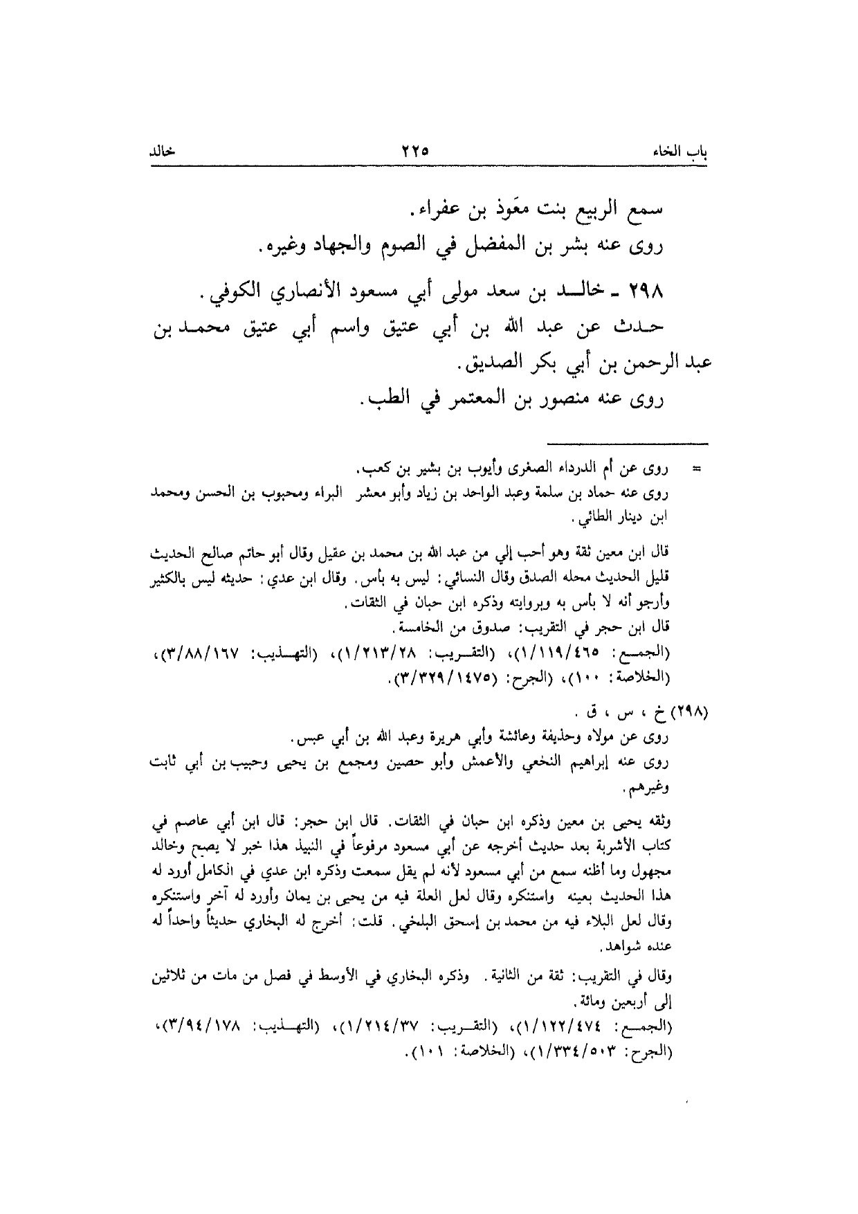298 - خَالِد بن سعد مولَى أبي مَسْعُود الْأنْصَارِيّ الْكُوفِي حدث عَن عبد الله بن أبي عَتيق وَاسم أبي عَتيق مُحَمَّد بن عبد الرَّحْمَن بن أبي بكر الصّديق رَوَى عَنهُ عَنهُ مَنْصُور بن الْمُعْتَمِر فِي الطِّبّ