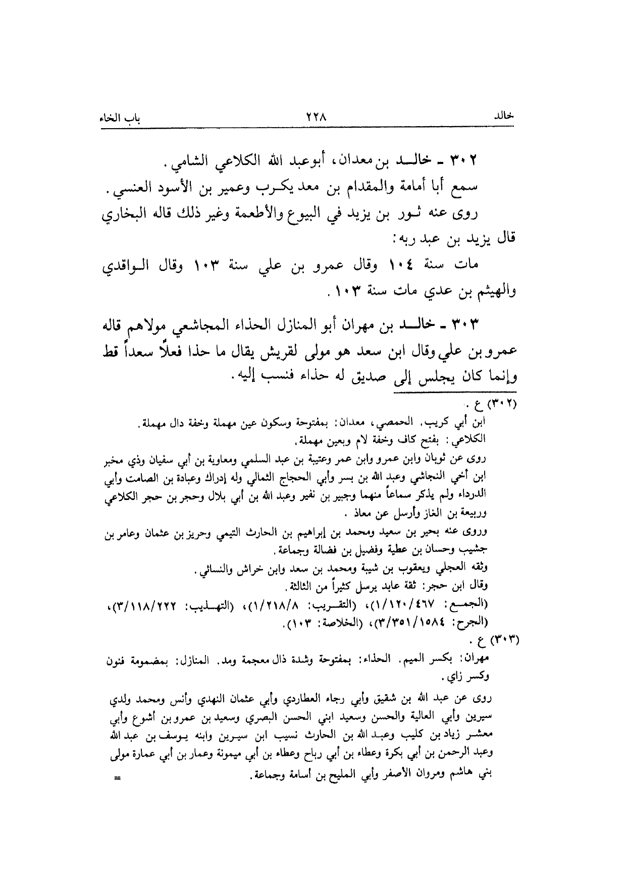 302 - خَالِد بن معدان أَبُو عبد الله الكلَاعِي الشَّامي سمع أَبَا أُمَامَة والمقدام بن معد يكرب وَعُمَيْر بن الْأسود الْعَنسِي رَوَى عَنهُ ثَوْر بن يزِيد فِي الْبيُوع والأطعمة وَغير ذَلِك قَالَه البُخَارِيّ قَالَ يزِيد بن عبد ربه مَاتَ سنة 104 وَقَالَ عَمْرو بن عَلّي سنة 103 وَقَالَ الْوَاقِدِيّ والهيثم بن عدي مَاتَ سنة 103