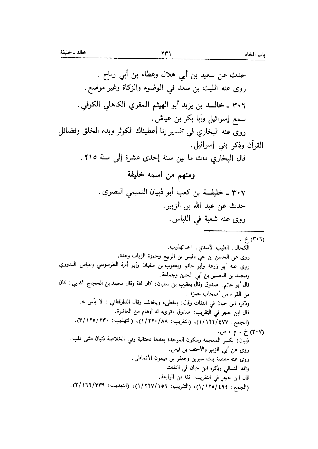 306 - خَالِد بن يزِيد أَبُو الْهَيْثَم الْمقري الْكَاهِلِي الْكُوفِي سمع إِسْرَائِيل وَأَبا بكر بن عَيَّاش رَوَى عَنهُ البُخَارِيّ فِي تَفْسِير إِنَّا أعطيناك الْكَوْثَر وبدء الْخلق وفصائل الْقُرْآن وَذكر بني إِسْرَائِيل قَالَ البُخَارِيّ مَاتَ مَا بَين سنة إِحْدَى عشرَة إِلَى سنة 215