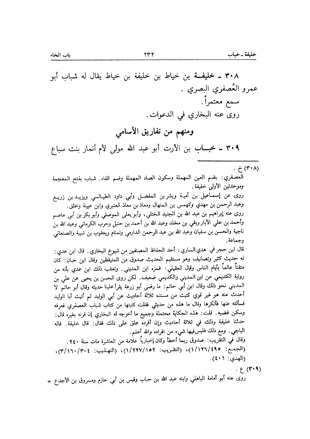 308 - خَليفَة بن خياط بن خَليفَة بن خياط يُقَال لَهُ شباب أَبُو عَمْرو الْعُصْفُرِي الْبَصْرِيّ سمع مُعْتَمِرًا رَوَى عَنهُ البُخَارِيّ فِي الدَّعْوَات