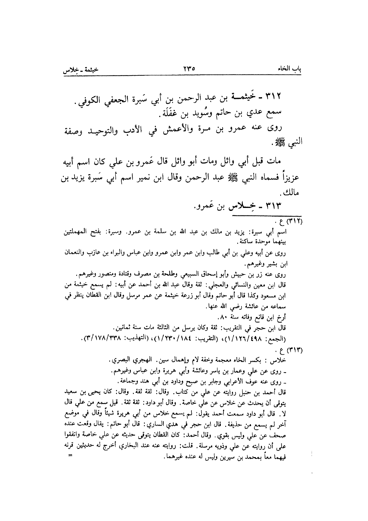 312 - خَيْثَمَة بن عبد الرَّحْمَن بن أبي سُبْرَة الْجعْفِيّ الْكُوفِي سمع عدي بن حَاتِم وسُويد بن غَفلَة رَوَى عَنهُ عَنهُ عَمْرو بن مرّة وَالْأَعْمَش فِي الْأَدَب والتوحيد وَصفَة النَّبِي صَلَّى الله عَلَيْهِ وَسلم مَاتَ قبل أبي وَائِل وَمَات أَبُو وَائِل قَالَ عَمْرو بن عَلّي كَانَ اسْم أَبِيه عَزِيزًا فَسَماهُ النَّبِي صَلَّى الله عَلَيْهِ وَسلم عبد الرَّحْمَن وَقَالَ ابْن نمير اسْم أبي سُبْرَة يزِيد بن مَالك