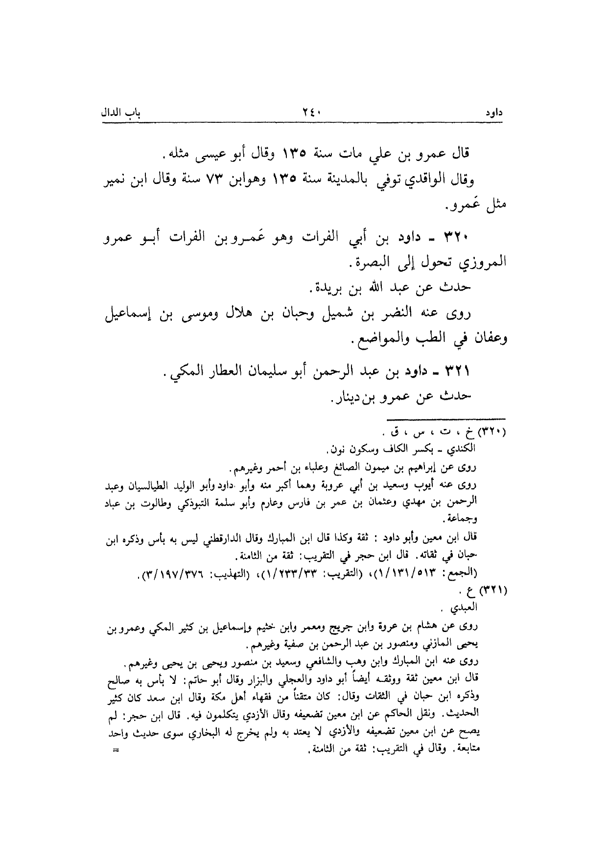 320 - دَاوُد بن أبي الْفُرَات وَهُوَ عَمْرو بن الْفُرَات أَبُو عَمْرو الْمروزِي تحول إِلَى الْبَصْرَة حدث عَن عبد الله بن بُرَيْدَة رَوَى عَنهُ النَّضر بن شُمَيْل وحبان بن هِلَال ومُوسَى بن إِسْمَاعِيل وَعَفَّان فِي الطِّبّ والمواضع