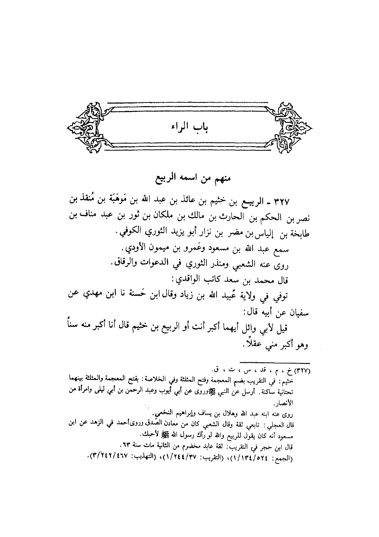 327 - الرّبيع بن خثيم بن عَائِذ بن عبد الله بن موهبة بن منقذ بن نصر بن الحكم بن الْحَارِث بن مَالك بن ملكان بن ثَوْر بن عبد منَاف بن طابخة بن إلْيَاس بن مُضر بن نزار أَبُو يزِيد الثَّوْريّ الْكُوفِي سمع عبد الله بن مَسْعُود وَعَمْرو بن مَيْمُون الأودي رَوَى عَنهُ الشّعبِيّ وَمُنْذِر الثَّوْريّ فِي الدَّعْوَات والرقاق قَالَ مُحَمَّد بن سعد كَاتب الْوَاقِدِيّ توفّي فِي ولَايَة عبيد الله بن زِيَاد وَقَالَ ابْن حَسَنَة نَا ابْن مهْدي عَن سُفْيَان عَن أَبِيه قَالَ قيل لأبي وَائِل أَيهمَا أكبر أَنْت أَو الرّبيع بن خثيم قَالَ أَنا أكبر مِنْهُ سنا وَهُوَ أكبر مني عقلا