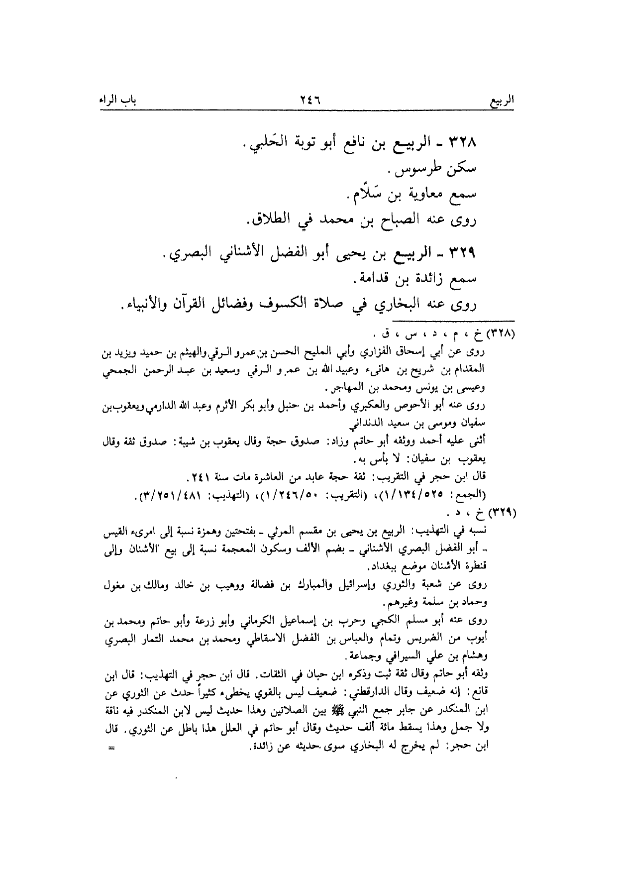 329 - الرّبيع بن يَحْيَى أَبُو الْفضل الْأُشْنَانِي الْبَصْرِيّ سمع زَائِدَة بن قدامَة رَوَى عَنهُ البُخَارِيّ فِي صَلَاة الْكُسُوف وفضائل الْقُرْآن والأنبياء