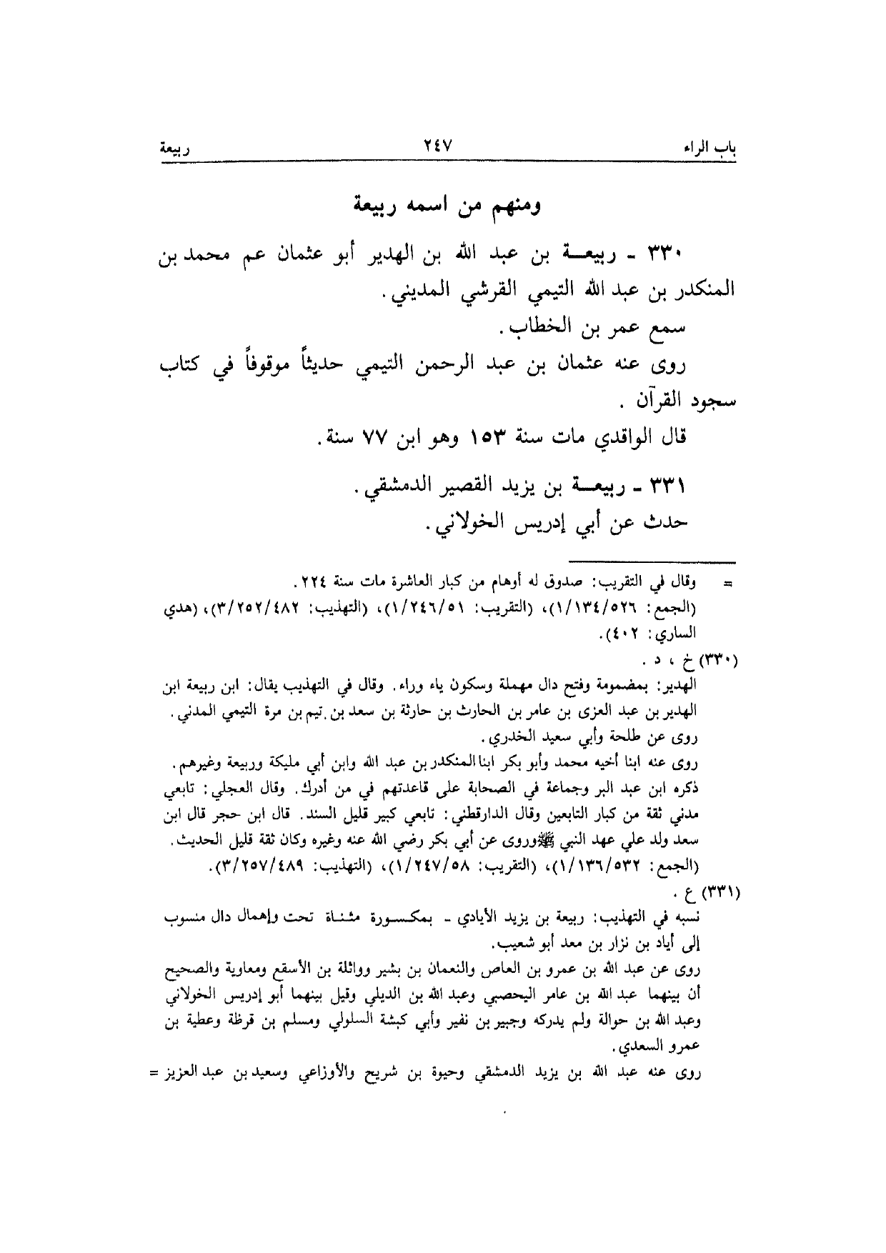 330 - ربيعَة بن عبد الله بن الهدير أَبُو عُثْمَان عَم مُحَمَّد بن الْمُنْكَدر بن عبد الله التَّيْمِيّ الْقرشِي الْمَدِينِيّ سمع عمر بن الْخطاب رَوَى عَنهُ عُثْمَان بن عبد الرَّحْمَن التَّيْمِيّ حَدِيثا مَوْقُوفا فِي كتاب سُجُود الْقُرْآن قَالَ الْوَاقِدِيّ مَاتَ سنة 153 وَهُوَ ابْن 77 سنة