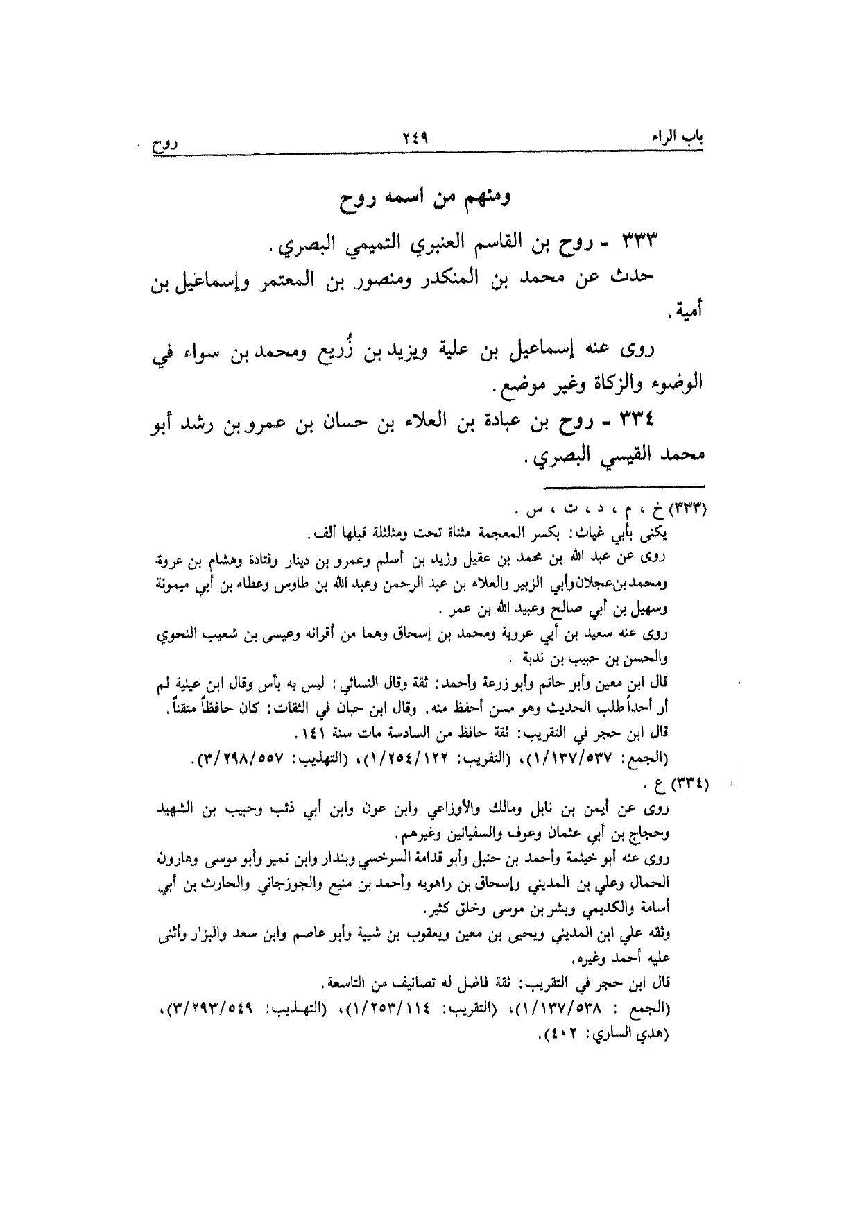 333 - روح بن الْقَاسِم الْعَنْبَري التَّمِيمِي الْبَصْرِيّ حدث عَن مُحَمَّد بن الْمُنْكَدر وَمَنْصُور بن الْمُعْتَمِر وَإِسْمَاعِيل بن أُميَّة رَوَى عَنهُ إِسْمَاعِيل بن علية وَيزِيد بن زُرَيْع وَمُحَمّد بن سَوَاء فِي الْوضُوء وَالزَّكَاة وَغير مَوضِع