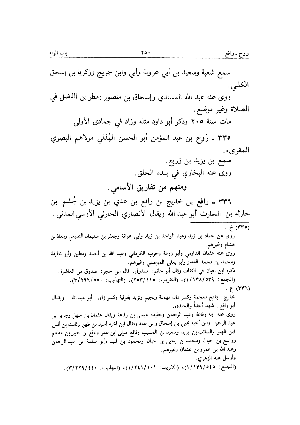 335 - روح بن عبد الله الْمُؤمن أَبُو الْحسن الْهُذلِيّ مَوْلَاهُم الْبَصْرِيّ الْمُقْرِئ سمع بن يزِيد بن زُرَيْع رَوَى عَنهُ م البُخَارِيّ فِي بَدْء الْخلق