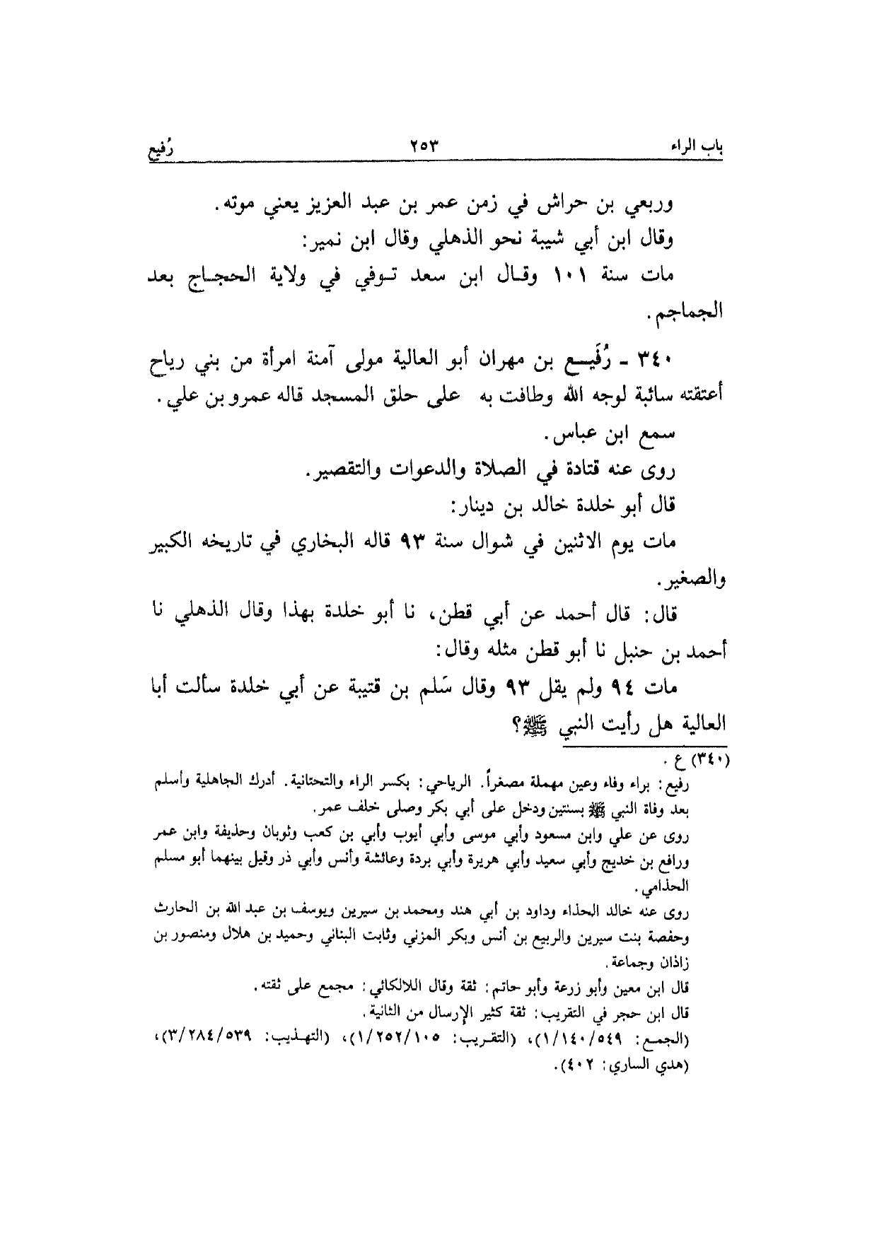 240 - رفيع بن مهْرَان أَبُو الْعَالِيَة مولَى آمِنَة امْرَأَة من بني ريَاح أَعتَقته سائبة لوجه الله وطافت بِهِ عَلَى حلق الْمَسْجِد قَالَه عَمْرو بن عَلّي سمع ابْن عَبَّاس رَوَى عَنهُ قَتَادَة فِي الصَّلَاة والدعوات وَالتَّقْصِير قَالَ أَبُو خلدَة خَالِد بن دِينَار مَاتَ يَوْم الْإِثْنَيْنِ فِي شَوَّال سنة 93 قَالَه البُخَارِيّ فِي تَارِيخه الْكَبِير وَالصَّغِير قَالَ قَالَ أَحْمد عَن أبي قطن نَا أَبُو خلدَة بِهَذَا وَقَالَ الذهلي نَا أَحْمد بن حَنْبَل نَا أَبُو قطن مثله وَقَالَ مَاتَ 94 وَلم يقل 93 وَقَالَ سلم بن قُتَيْبَة عَن أبي خلدَة سَأَلت أَبَا الْعَالِيَة هَل رَأَيْت النَّبِي صَلَّى الله عَلَيْهِ وَسلم
