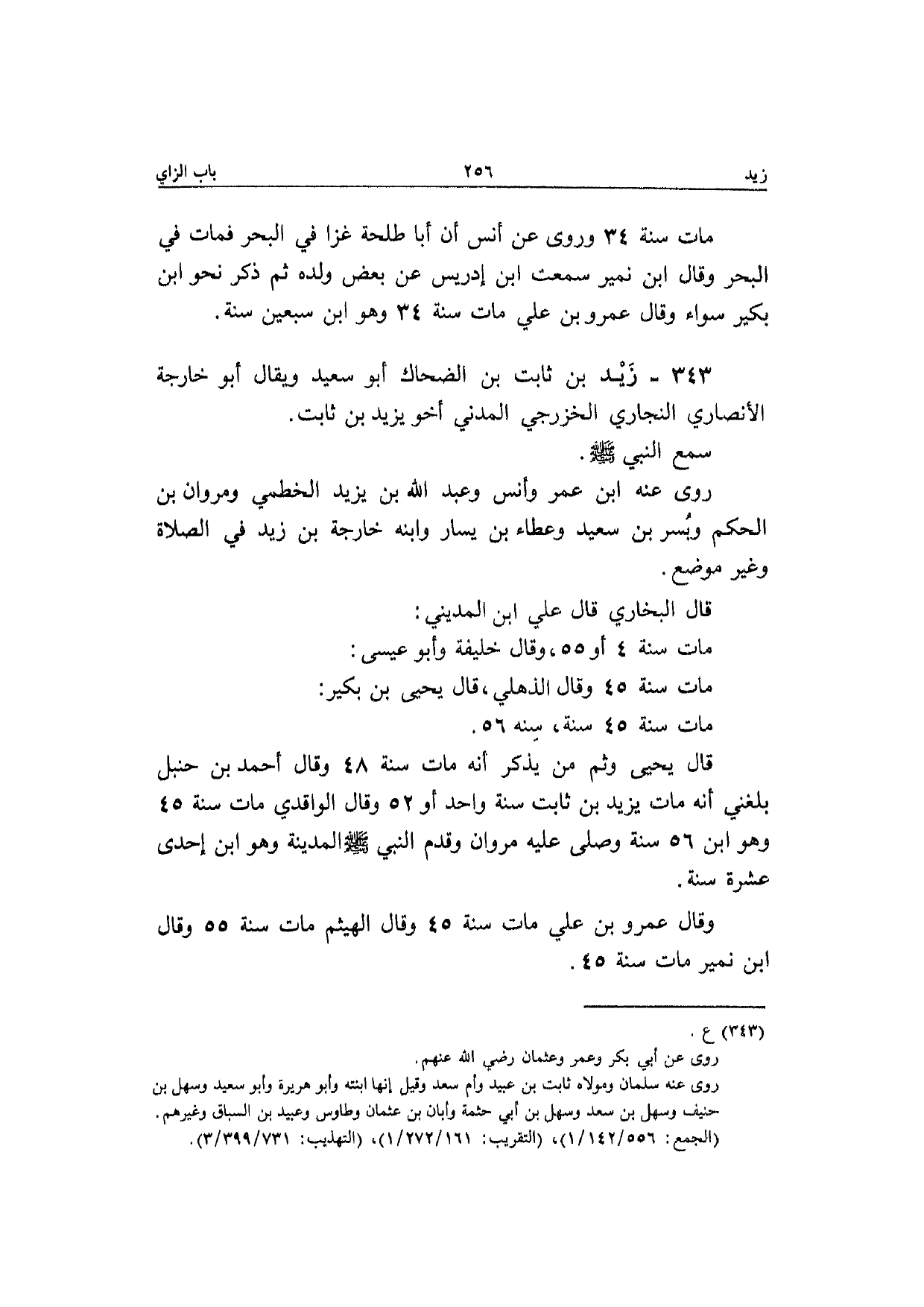 343 - زيد بن ثَابت بن الضَّحَّاك أَبُو سعيد وَيُقَال أَبُو خَارِجَة الْأنْصَارِيّ النجاري الخزرجي الْمدنِي أَخُو يزِيد بن ثَابت سمع النَّبِي صَلَّى الله عَلَيْهِ وَسلم رَوَى عَنهُ ابْن عمر وانس وَعبد الله بن يزِيد الخطمي ومروان بن الحكم وَبسر بن سعيد وَعَطَاء بن يسَار وَابْنه خَارِجَة بن زيد فِي الصَّلَاة وَغير مَوضِع قَالَ البُخَارِيّ قَالَ عَلّي بن الْمَدِينِيّ مَاتَ سنة 4 أَو 55 وَقَالَ خَليفَة وَأَبُو عِيسَى مَاتَ سنة 45 وَقَالَ الذهلي قَالَ يَحْيَى بن بكير مَاتَ سنة 45 سنة سنه 56 قَالَ يَحْيَى وَثمّ من يذكر انه مَاتَ سنة 48 وَقَالَ أَحْمد بن حَنْبَل بَلغنِي انه مَاتَ يزِيد بن ثَابت سنة وَاحِد أَو 52 وَقَالَ الْوَاقِدِيّ مَاتَ سنة 45 وَهُوَ ابْن 56 سنة وَصَلى عَلَيْهِ مَرْوَان وَقدم النَّبِي صَلَّى الله عَلَيْهِ وَسلم الْمَدِينَة وَهُوَ ابْن إِحْدَى عشرَة سنة وَقَالَ عَمْرو بن عَلّي مَاتَ سنة 45 وَقَالَ الْهَيْثَم مَاتَ سنة 55 وَقَالَ ابْن نمير مَاتَ سنة 45