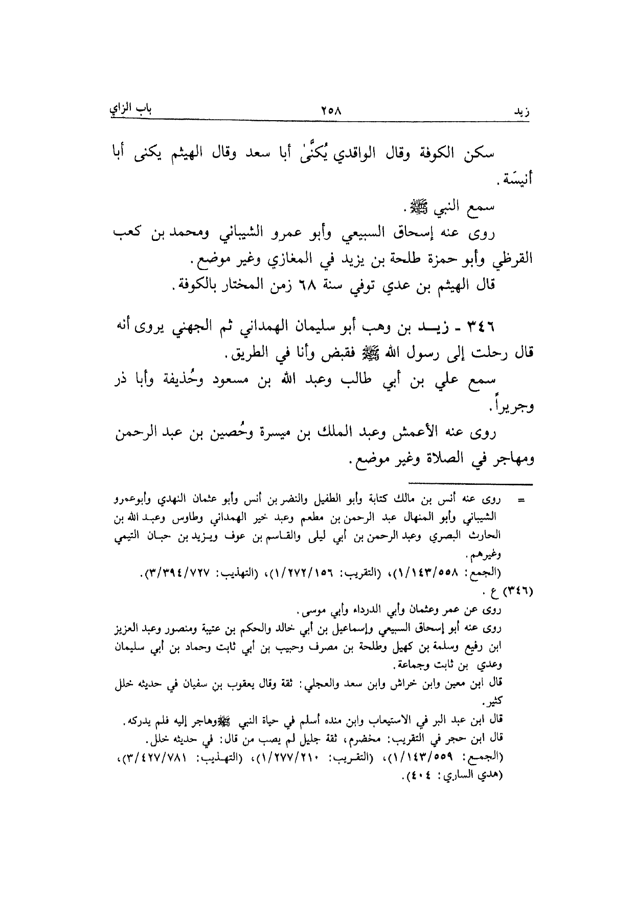 346 - زيد بن وهب أَبُو سُلَيْمَان الْهَمدَانِي ثمَّ الْجُهَنِيّ يرْوَى انه قَالَ رحلت إِلَى رَسُول الله صَلَّى الله عَلَيْهِ وَسلم فَقبض وَأَنا فِي الطّرق سمع عَلّي بن أبي طَالب وَعبد الله بن مَسْعُود وَحُذَيْفَة وَأَبا ذَر وجريرا رَوَى عَنهُ الْأَعْمَش وَعبد الْملك بن ميسرَة وحصين بن عبد الرَّحْمَن ومهاجر فِي الصَّلَاة وَغير مَوضِع