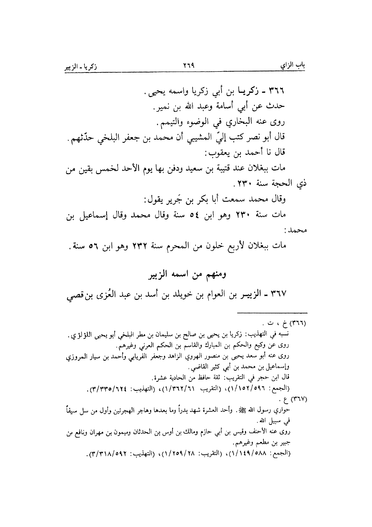366 - زَكَرِيَّا بن أبي زَكَرِيَّا واسْمه يَحْيَى حدث عَن أبي أُسَامَة وَعبد الله بن نمير رَوَى عَنهُ البُخَارِيّ فِي الْوضُوء وَالتَّيَمُّم قَالَ أَبُو نصر كتب إِلَيّ المشيبي أَن مُحَمَّد بن جَعْفَر الْبَلْخِي حَدثهمْ قَالَ نَا أَحْمد بن يَعْقُوب مَاتَ ببغلان عِنْد قُتَيْبَة بن سعيد وَدفن بهَا يَوْم الْأَحَد لخمس بَقينَ من ذِي الْحجَّة سنة 230 وَقَالَ مُحَمَّد سَمِعت أَبَا بكر بن جرير يَقُول مَاتَ سنة 230 وَهُوَ ابْن 54 سنة وَقَالَ مُحَمَّد وَقَالَ إِسْمَاعِيل بن مُحَمَّد مَاتَ ببغلان لأَرْبَع خلون من الْمحرم سنة 232 وَهُوَ ابْن 56 سنة
