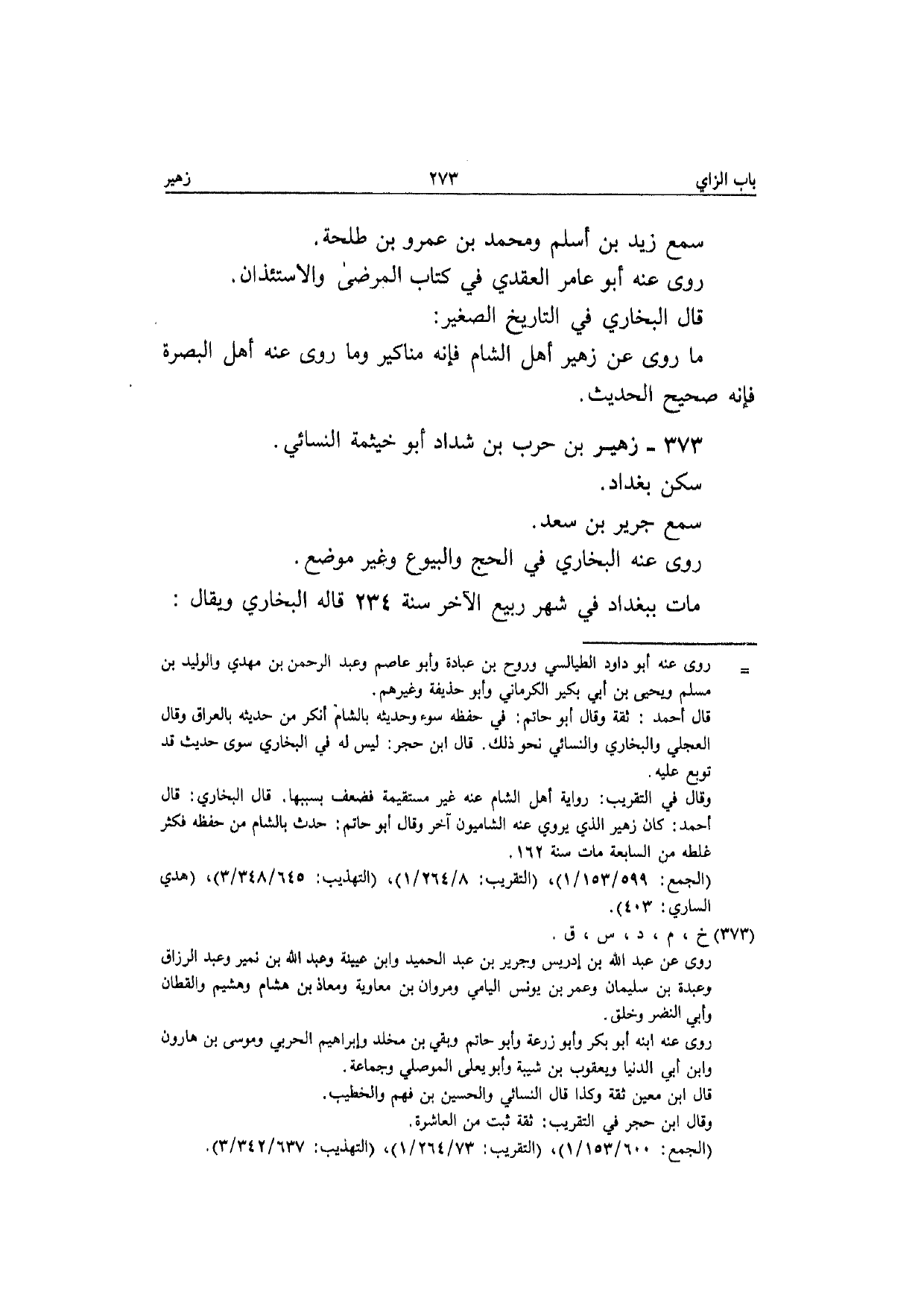 373 - زُهَيْر بن حَرْب بن شَدَّاد أَبُو خَيْثَمَة النَّسَائِيّ سكن بَغْدَاد سمع جرير بن سعد رَوَى عَنهُ البُخَارِيّ فِي الْحَج والبيوع وَغير مَوضِع مَاتَ بِبَغْدَاد فِي شهر ربيع الآخر سنة 234 قَالَه البُخَارِيّ وَيُقَال