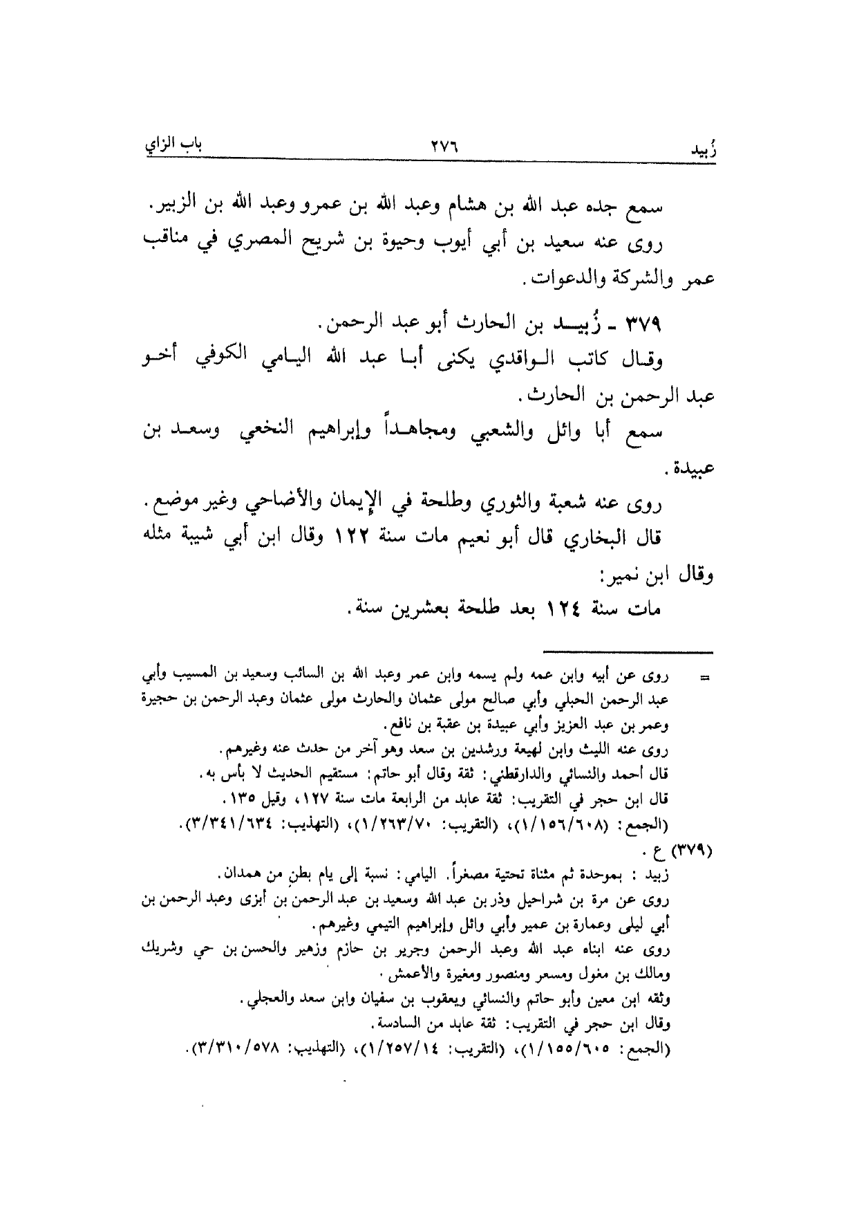 379 - زبيد بن الْحَارِث أَبُو عبد الرَّحْمَن وَقَالَ كَاتب الْوَاقِدِيّ يكنى أَبَا عبد الله اليامي الْكُوفِي أَخُو عبد الرَّحْمَن بن الْحَارِث سمع أَبَا وَائِل وَالشعْبِيّ ومجاهدا وَإِبْرَاهِيم النَّخعِيّ وَسعد بن عُبَيْدَة رَوَى عَنهُ شُعْبَة وَالثَّوْري وَطَلْحَة فِي الْإِيمَان وَالْأَضَاحِي وَغير مَوضِع قَالَ البُخَارِيّ قَالَ أَبُو نعيم مَاتَ سنة 122 وَقَالَ ابْن أبي شيبَة مثله وَقَالَ ابْن نمير مَاتَ سنة 124 بعد طَلْحَة بِعشْرين سنة